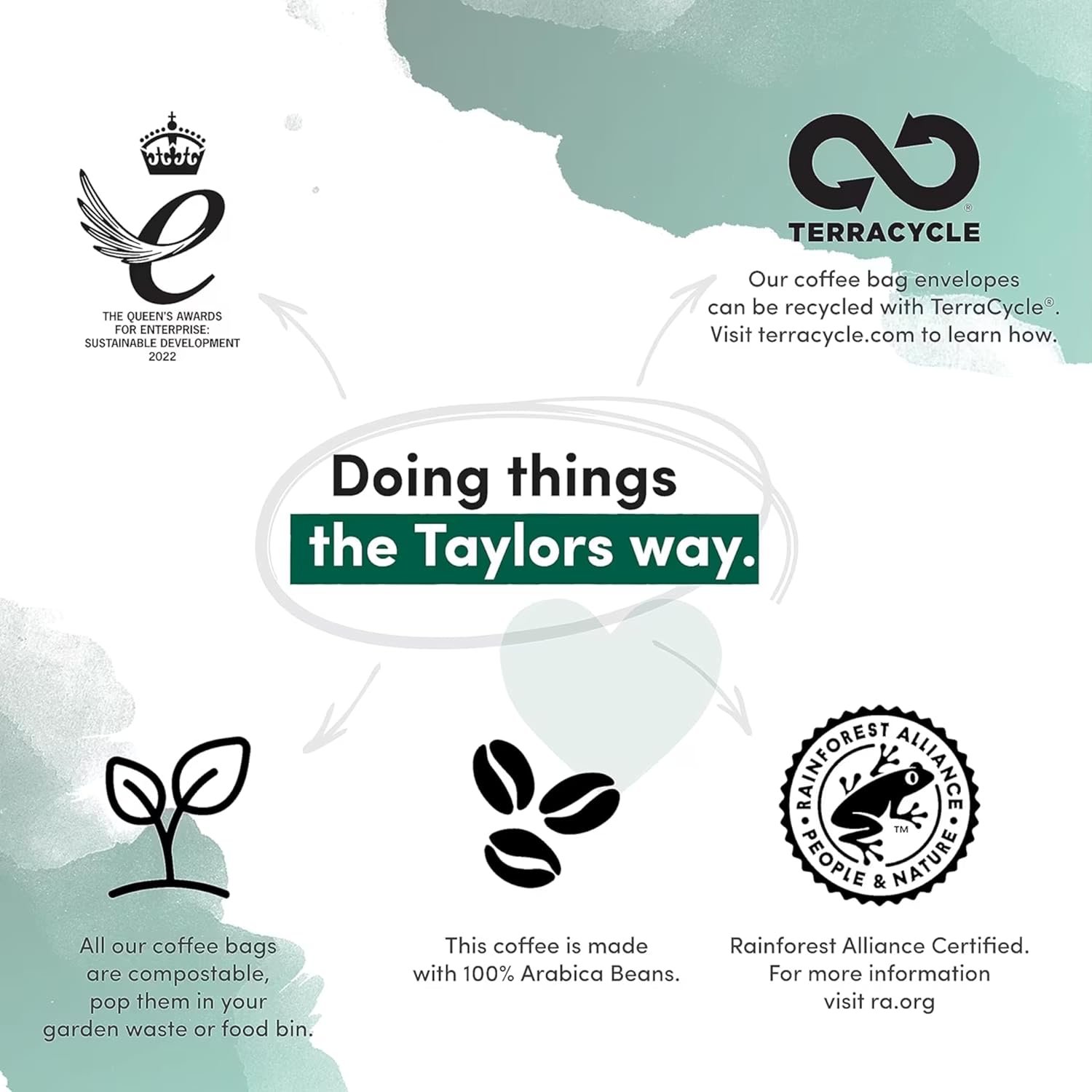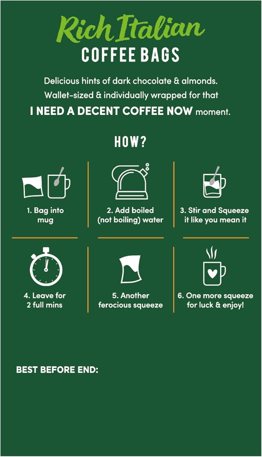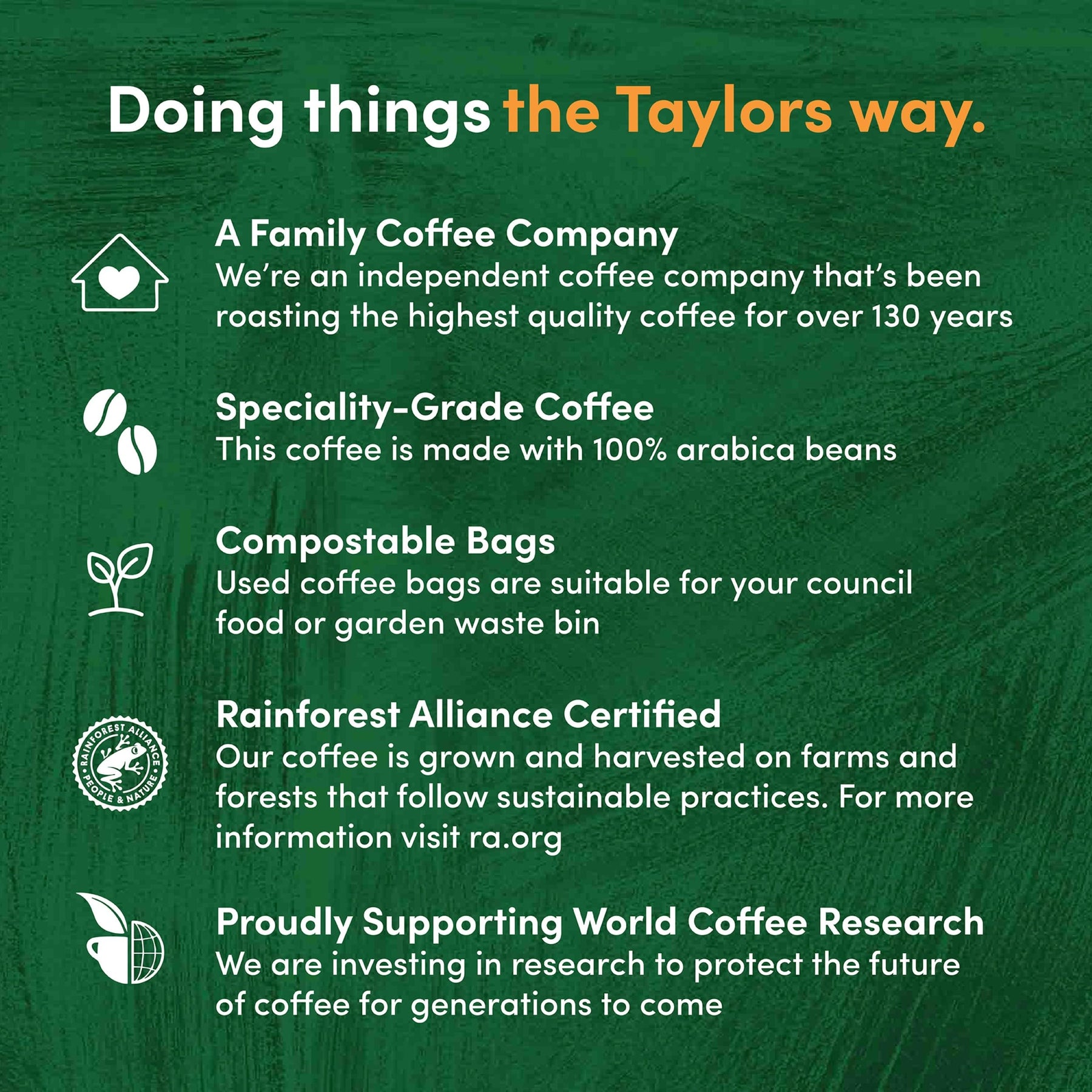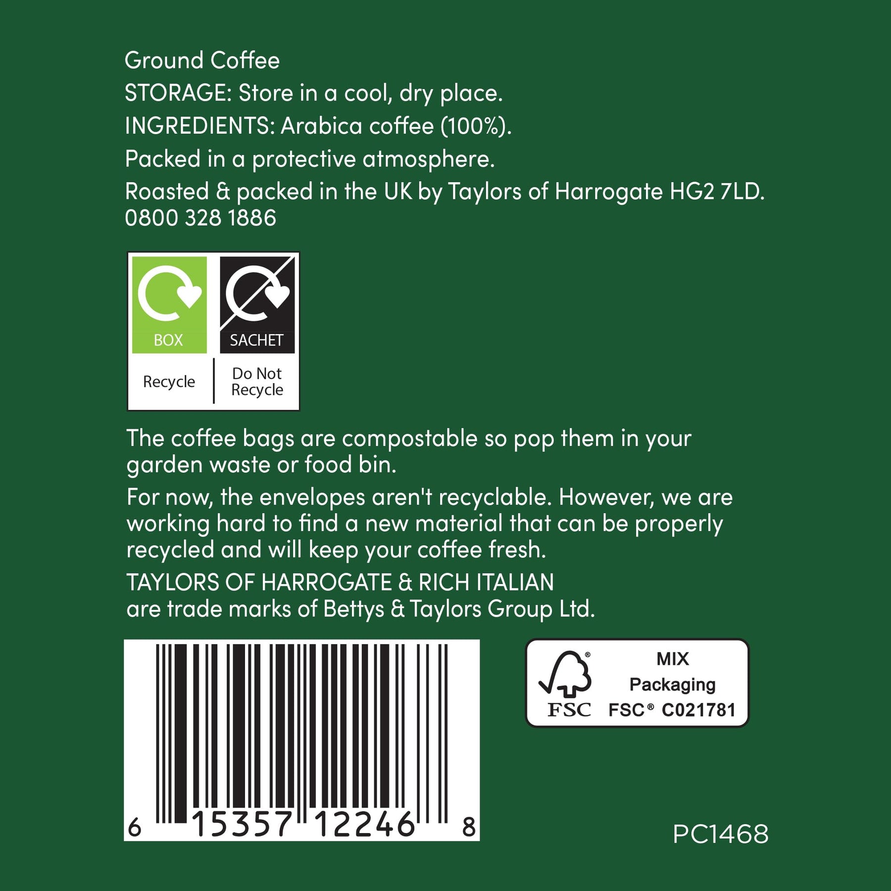 Experience the rich, luxurious taste of Northern Italy with Taylors of Harrogate Rich Italian Coffee Bags. Each individually wrapped bag delivers a refined medium roast crafted from 100% Arabica coffee, offering deep notes of dark chocolate and almond. Perfect for enjoying after a meal or anytime you crave a sophisticated coffee moment.