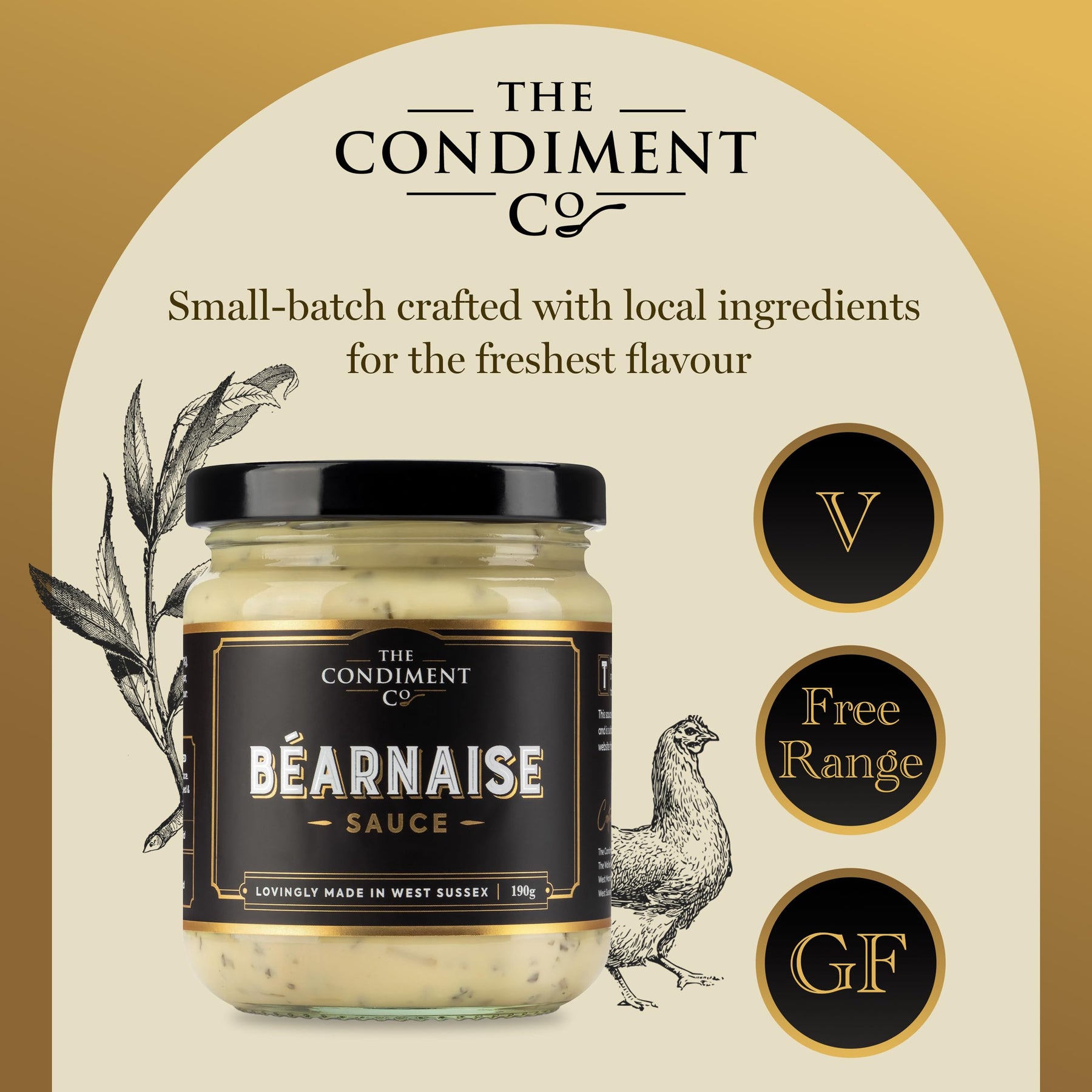 Indulge in the rich, creamy taste of The Condiment Company Bearnaise Sauce, a gourmet condiment crafted for steak and seafood lovers. Made with fragrant tarragon, smooth butter, and free-range egg yolk, this gluten-free sauce delivers a luxurious French-inspired flavor to elevate everyday meals.