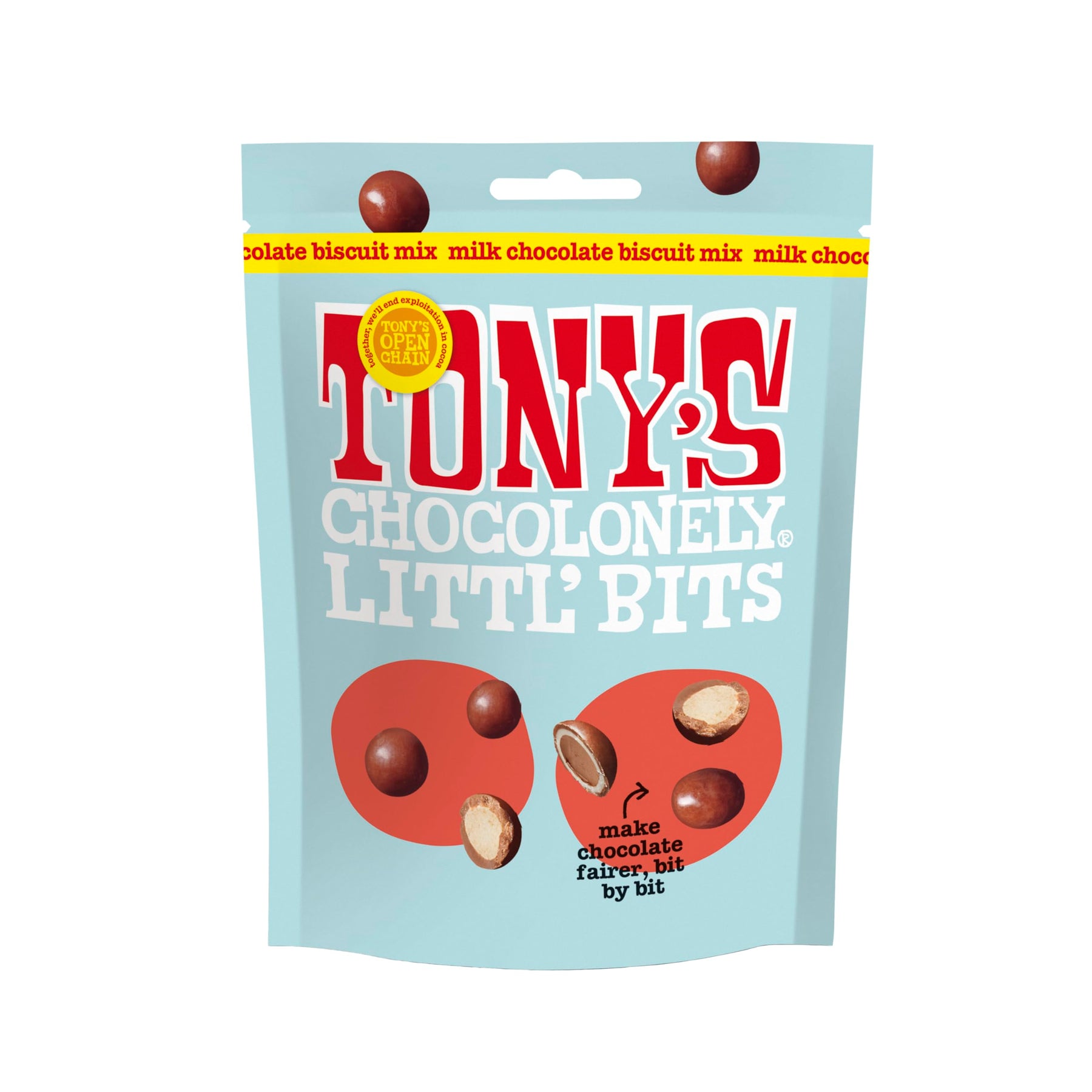 Dive into a delicious mix of chewy and crunchy chocolate-covered biscuit bits and creamy chocolate pieces, all coated in rich milk and white chocolate. Tony's Chocolonely Littl’ Bits are a fun, bite-sized treat that delivers bold flavor in every piece.