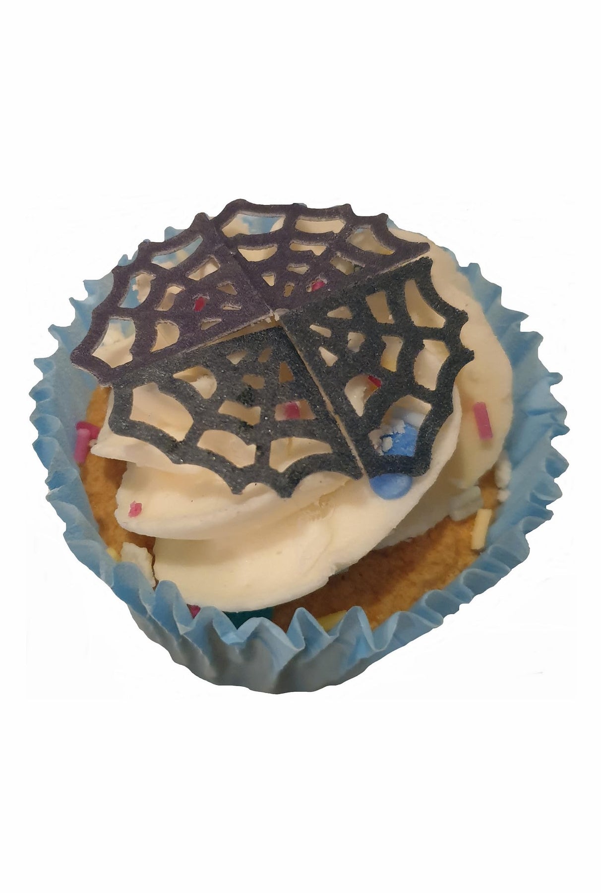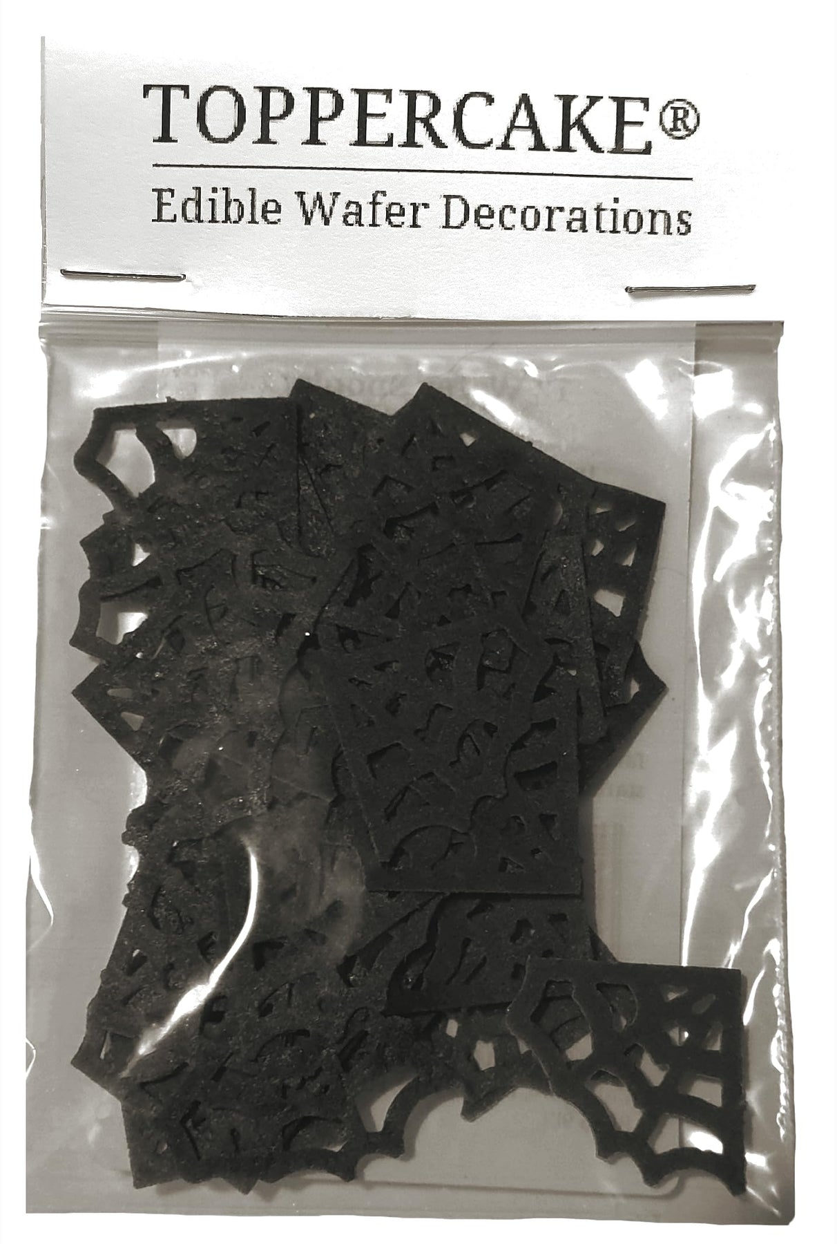 Precut edible wafer spider web corners by Toppercake add a spooky yet stylish touch to your Halloween baking creations. Each pack contains 12 pieces—enough to create six complete webs or use individually for subtle, eerie accents on cupcakes, cakes, or dessert displays. Made from high-quality edible wafer material in black/grey coloring, these toppers are perfect for themed parties and haunted desserts.