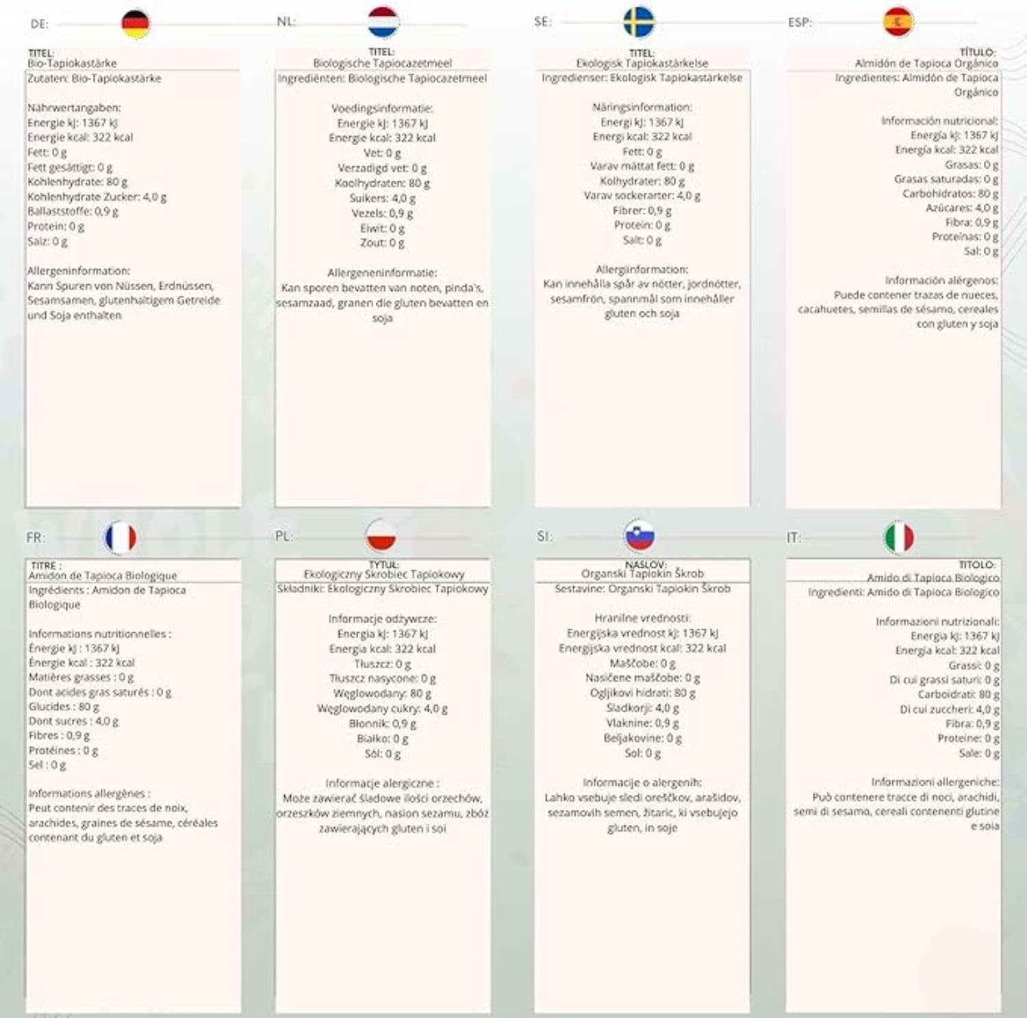 Tapioca starch, extracted from cassava root, is a versatile and natural ingredient used in baking and cooking. It works exceptionally well as a thickener in desserts, soups, fruit pies, and sauces, while also enhancing texture in breads and sponges. Ideal for gluten-free diets, it can replace maize or corn flour and blends seamlessly with other flours without altering flavor profiles. Adds crispiness to crusts and chewiness to baked goods, making it perfect for flatbreads, muffins, and springy loaves.