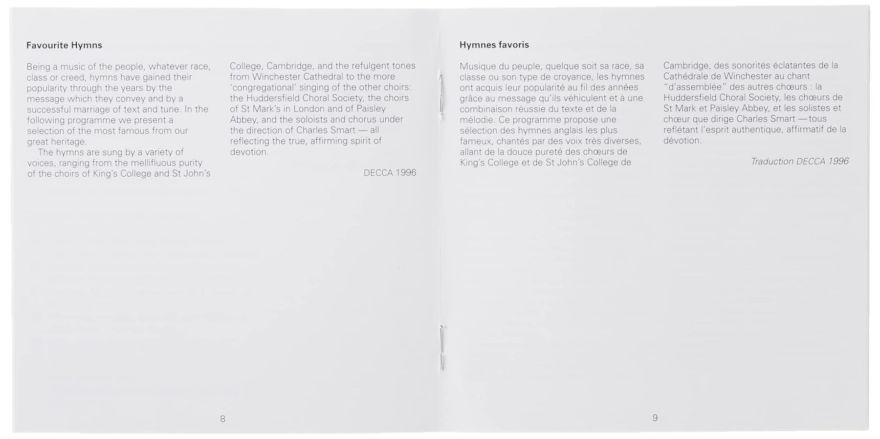 Compiled here are fifty of the most beloved hymns performed by three of England's most distinguished choirs. Every selection is sung in an appropriately dignified manner, offering over two hours of consistently well-rendered, quintessentially English treatments of these cherished vernacular favorites.