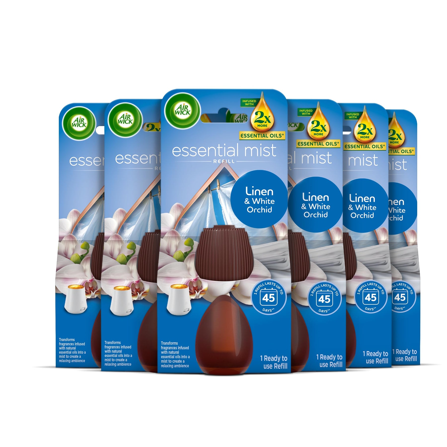 Enjoy long-lasting, luxurious fragrance in your home with Air Wick Essential Mist Refills in Linen & White Orchid. Specially designed for use with the Air Wick Essential Mist Diffuser, these refills release a continuous mist of natural essential oils, providing up to 45 days of fresh scent on the lowest setting. Transform your living space into a serene retreat with adjustable fragrance intensity and an 8-hour on, 16-hour off automatic cycle.