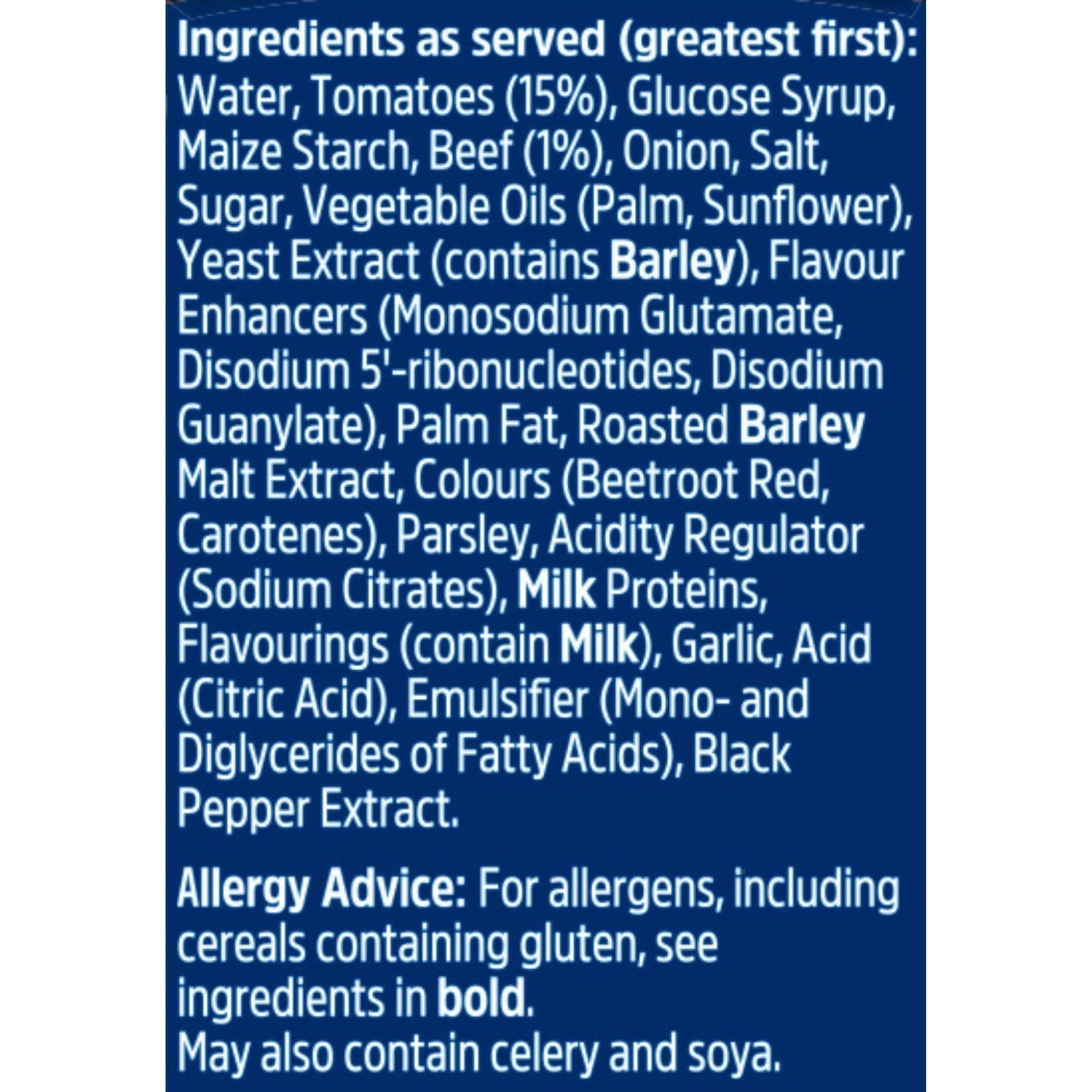 - Ingredients: Water, Tomatoes (15%), Glucose Syrup, Maize Starch, Beef (1%), Onion, Salt, Sugar, Vegetable Oils (Palm, Sunflower), Yeast Extract (contains BARLEY), Flavour Enhancers, Palm Fat, Roasted BARLEY Malt Extract, Colours, Parsley, Acidity Regulator, MILK Proteins, Flavourings (contain MILK), Garlic, Acid, Emulsifier, Black Pepper Extract