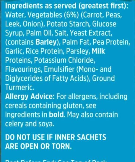 - Ingredients: Water, Vegetables (6%) (Carrot, Peas, Leek, Onion), Potato Starch, Glucose Syrup, Palm Oil, Salt, Yeast Extract (contains BARLEY), Palm Fat, Pea Protein, Garlic, Rice Protein, Parsley, MILK Proteins, Potassium Chloride, Flavourings, Emulsifier (Mono-and Diglycerides of Fatty Acids), Ground Turmeric