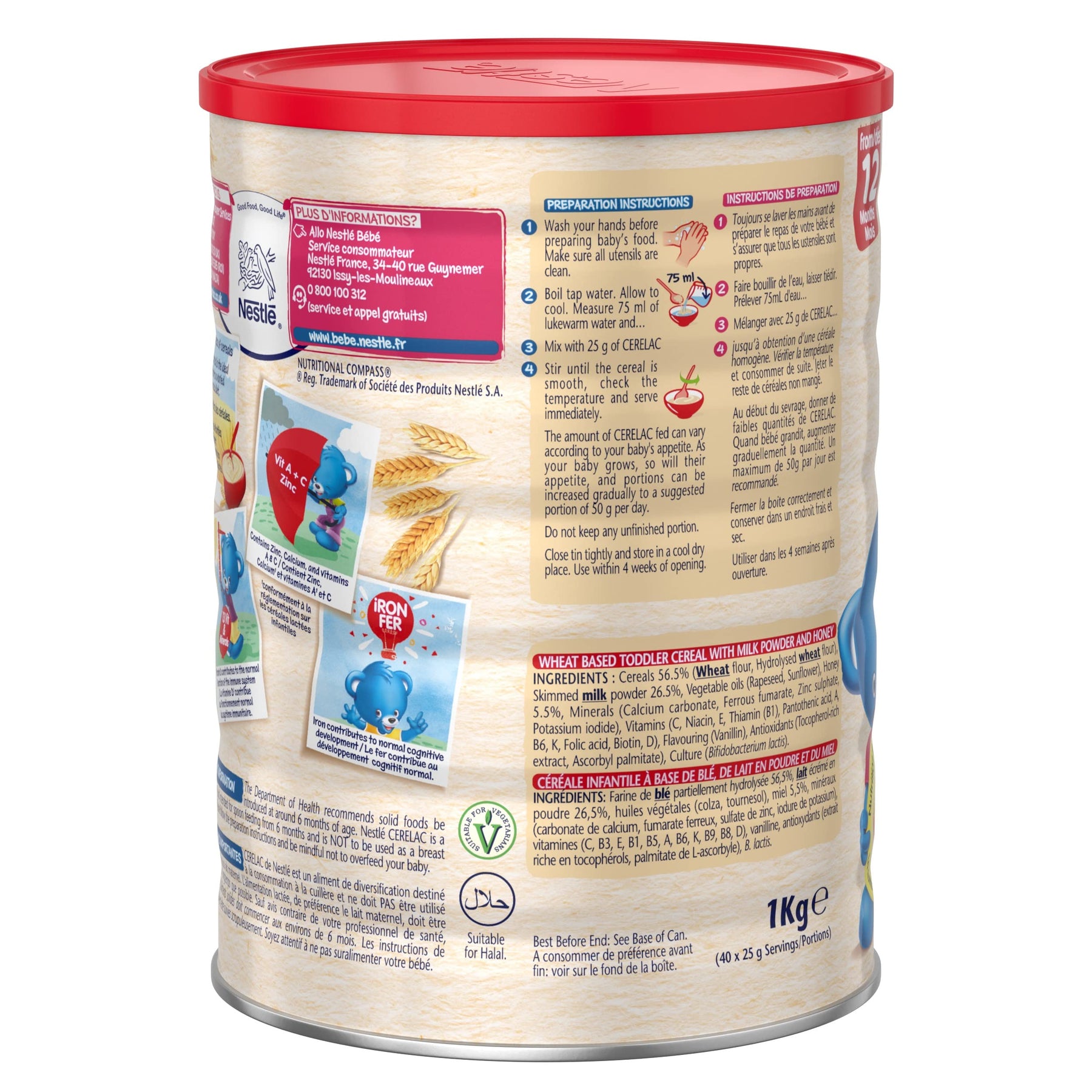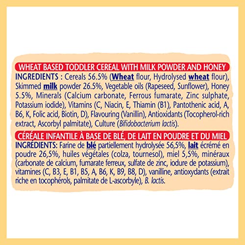Easy to prepare by simply adding water or milk, this vegetarian and halal-certified cereal is made with 53% cereals (including WHEAT flour and hydrolysed WHEAT flour), 20% skimmed MILK powder, 6.4% full fat MILK powder, and 5.5% honey. It also includes zinc, vitamins A, C, and B group vitamins, as well as added probiotics with Bifidobacterium lactis.