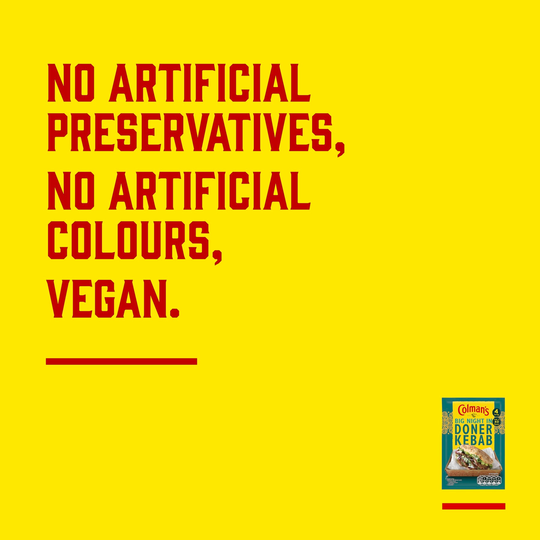 Recreate the UK's favourite takeaway-style doner kebab at home with Colman's Big Night In Doner Kebab Recipe Mix. This easy-to-use seasoning blend delivers full-on flavour with no artificial colours, preservatives, or added MSG, making it a trusted choice for a quick and delicious vegan-friendly meal.
