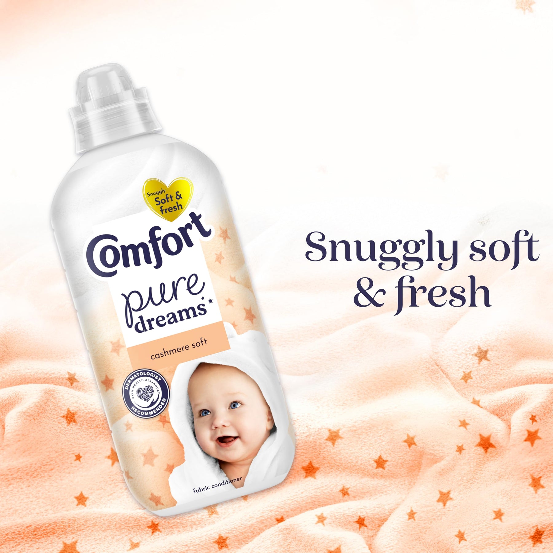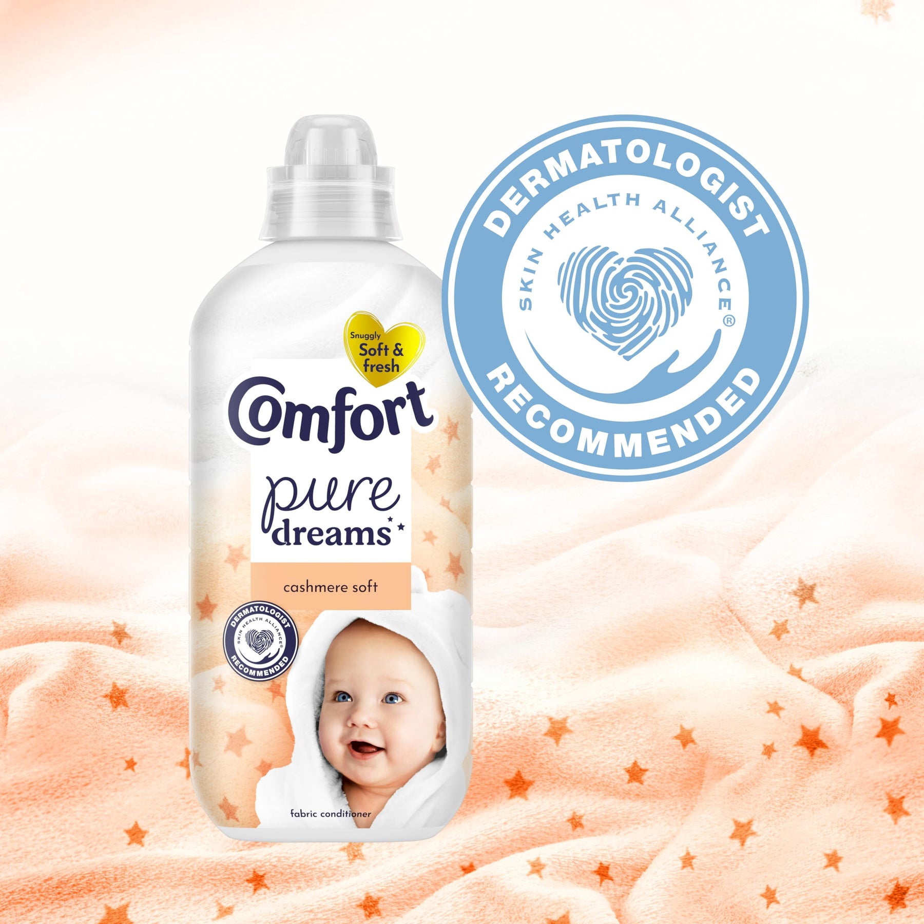 Infuse your laundry with a touch of care using Comfort Pure Dreams Cashmere Soft Fabric Conditioner. This gentle fabric softener is dermatologist recommended by the Skin Health Alliance, making it ideal for sensitive skin and the entire family, including babies. Experience luxuriously soft clothes with a delicate, soothing scent inspired by the softness of cashmere.