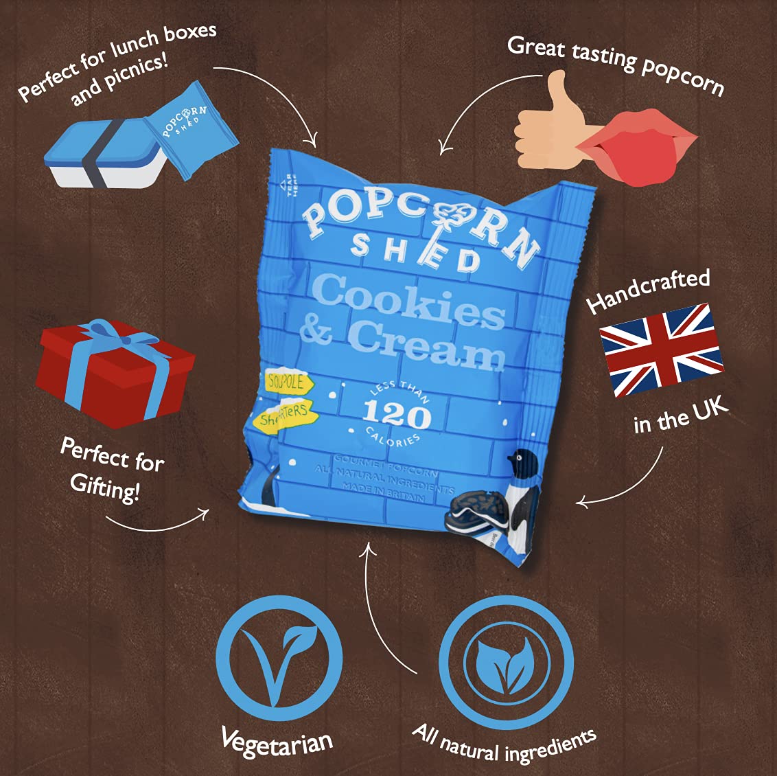 - Ingredients: Popped Corn, Sugar, White Chocolate Flavour Buttons (Sugar, Vegetable Fats (Palm, Shea), Whole Milk Powder, Emulsifier: Sunflower Lecithin, Natural Vanilla Flavouring), Chocolate Cookie Crumb (10%) (contains: Wheat Flour (Gluten), Sugar, Vegetable Oil (Palm), Cocoa Powder (4.6%), Wheat Starch (Gluten), Glucose-Fructose Syrup, Salt, Raising Agents, Emulsifiers: Sunflower Lecithin, Flavouring (Vanillin)), Glucose Syrup, Golden Syrup, Butter (contains Milk), Rapeseed Oil, Salt, Bicarbonate of Soda, Emulsifier: Sunflower Lecithin