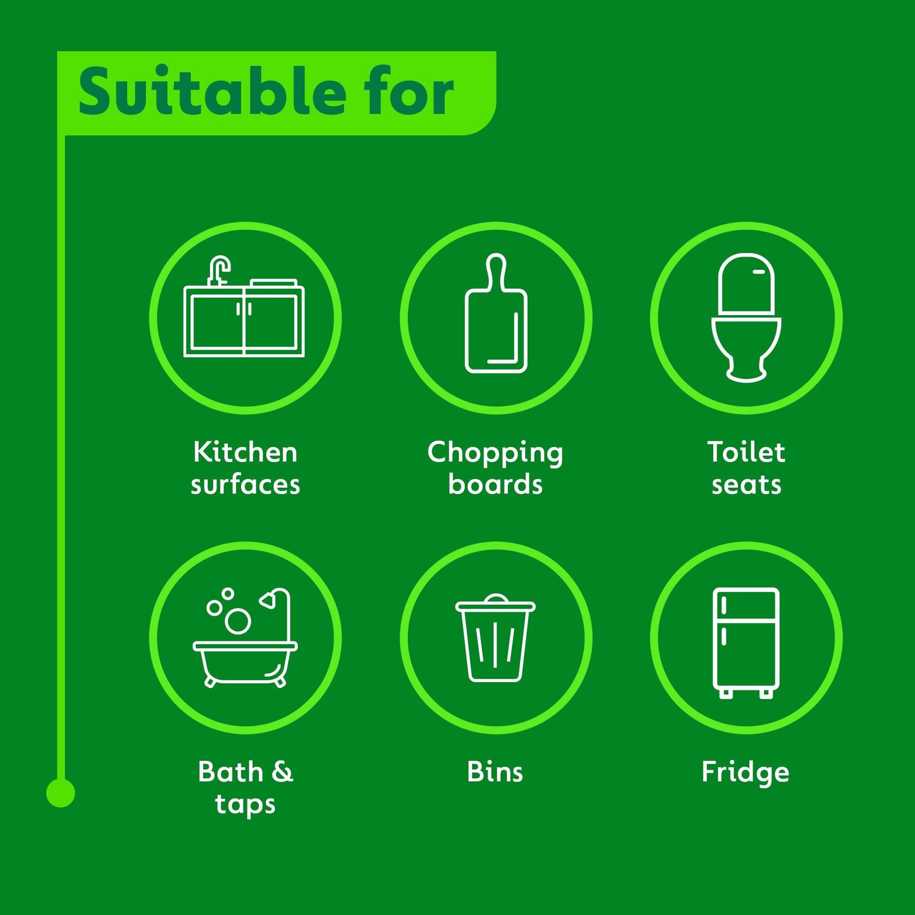 • Suitable for use on food preparation areas, baby equipment, kitchen, bathroom, and other hard, non-porous surfaces