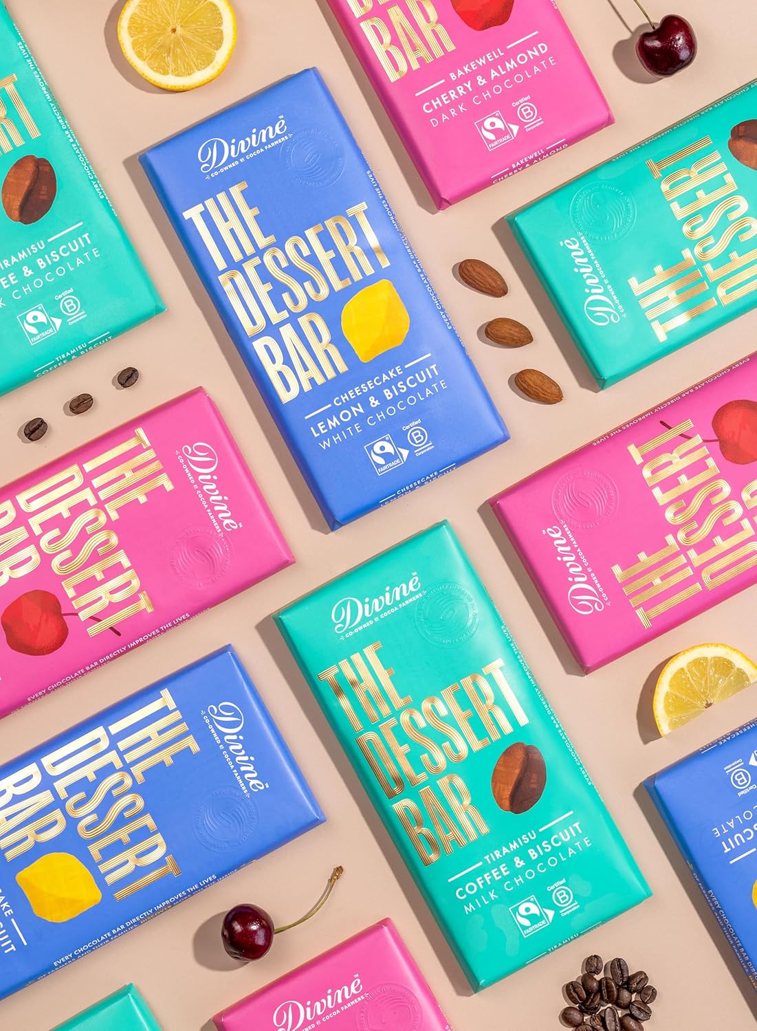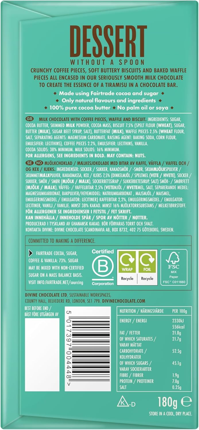 Indulge in a decadent dessert experience with Divine's Milk Chocolate Tiramisu Bar. This luxurious chocolate bar combines smooth 38% minimum cocoa milk chocolate with crunchy coffee pieces, soft buttery biscuits, and baked waffle chunks to capture the rich, creamy essence of a classic tiramisu in every bite.