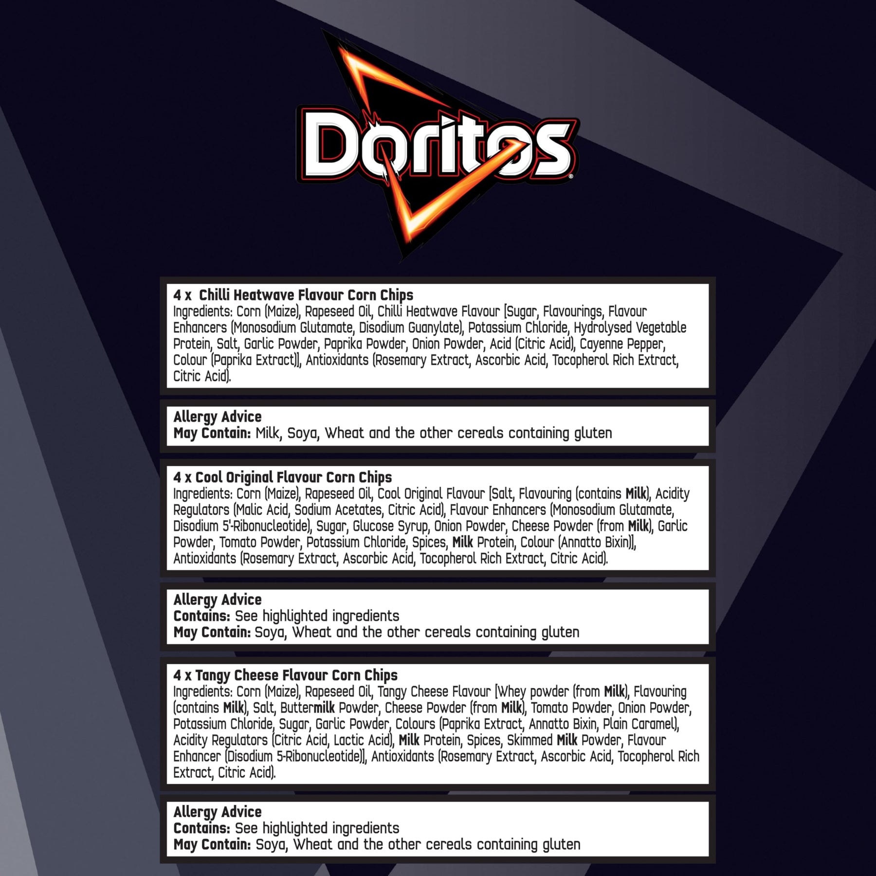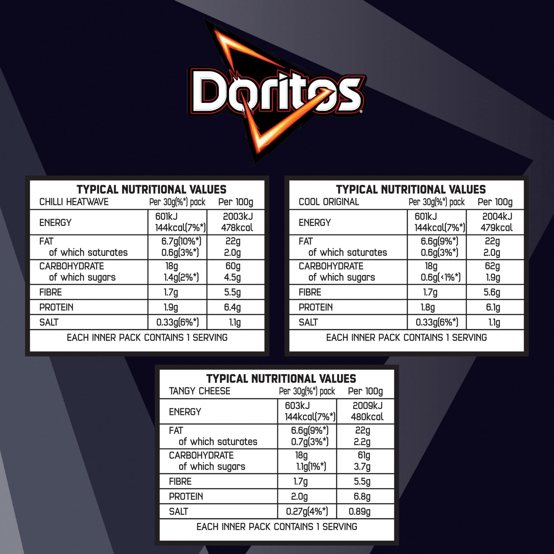 Doritos Variety Pack offers a bold snacking experience with a mix of intense flavours and full-on crunch. Perfect for sharing or enjoying on-the-go, this 12-pack assortment includes three popular flavours: Chilli Heatwave, Cool Original, and Tangy Cheese. Made with real corn (maize) and rapeseed oil, these tortilla chips contain no artificial colours or flavours and are suitable for vegetarians.