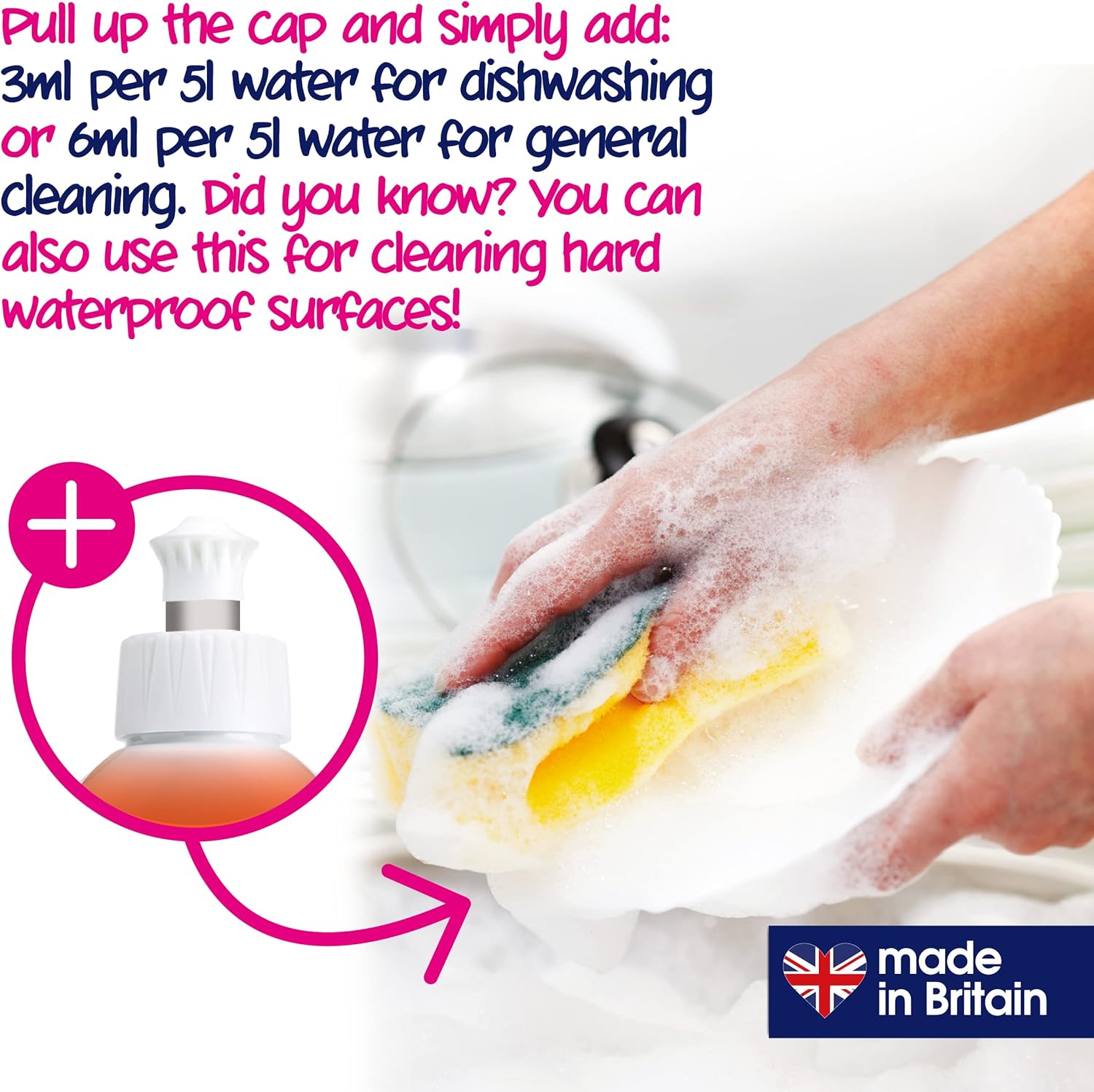 - Directions: Use 3ml per 5L water for dishwashing, 6ml per 5L for general cleaning