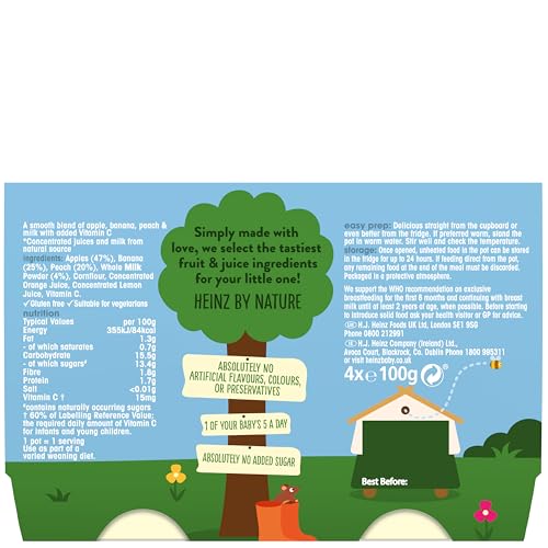 Apple (47%), Banana (25%), Peach (20%), Whole MILK Powder (4%), Cornflour, Concentrated Orange Juice, Concentrated Lemon Juice, Vitamin C. Enjoy straight from the cupboard or chilled from the fridge. For a warm serving, place the pot in warm water, stir well, and check temperature before feeding.