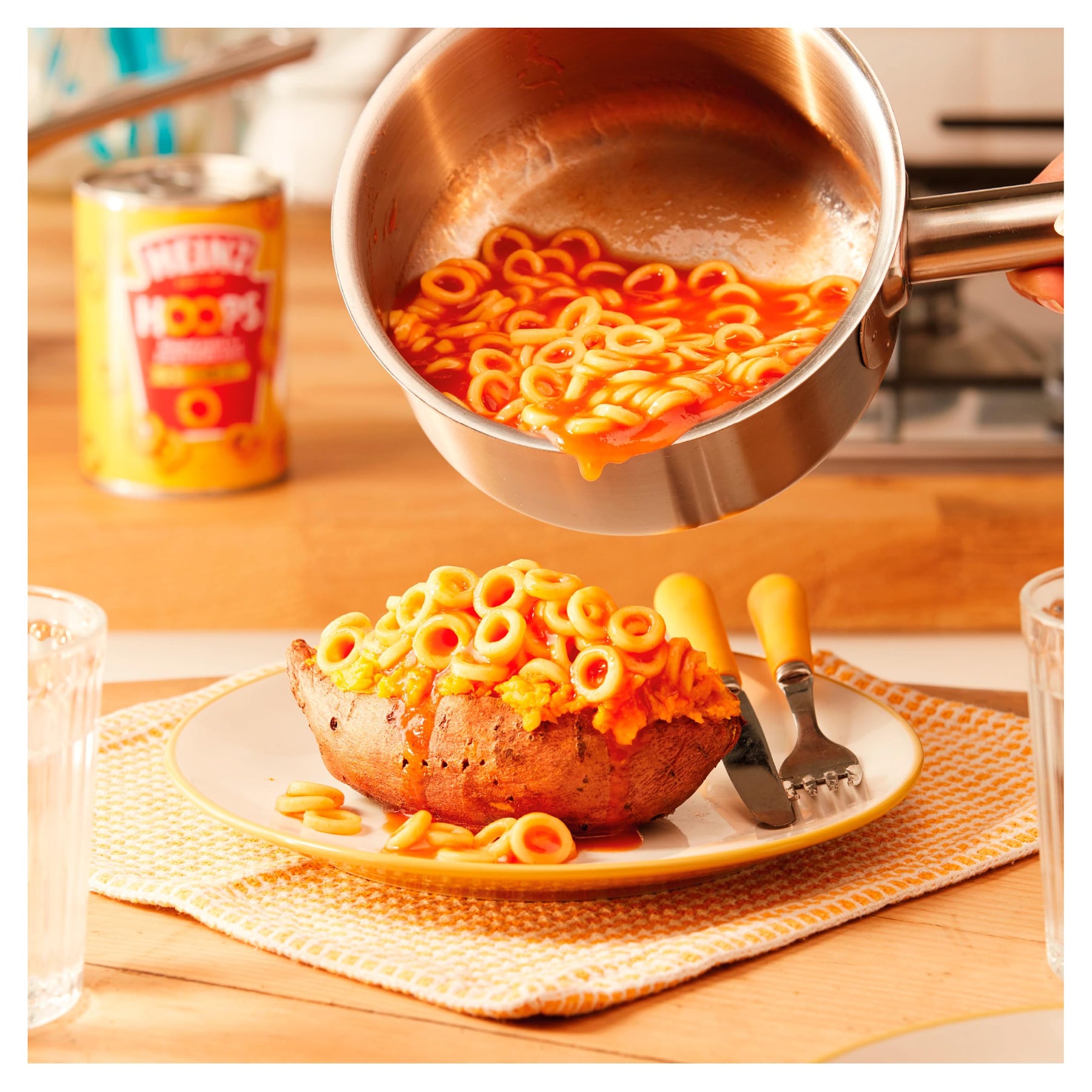Heinz Spaghetti Hoops in a rich tomato sauce offer a classic, comforting meal that's loved by kids and adults alike. Made with 42% spaghetti and 41% tomatoes, each can delivers a tasty, satisfying portion that's perfect on its own or served on toast. A half-can contributes to one of your 5 a day, making it a smart choice for balanced mealtimes.