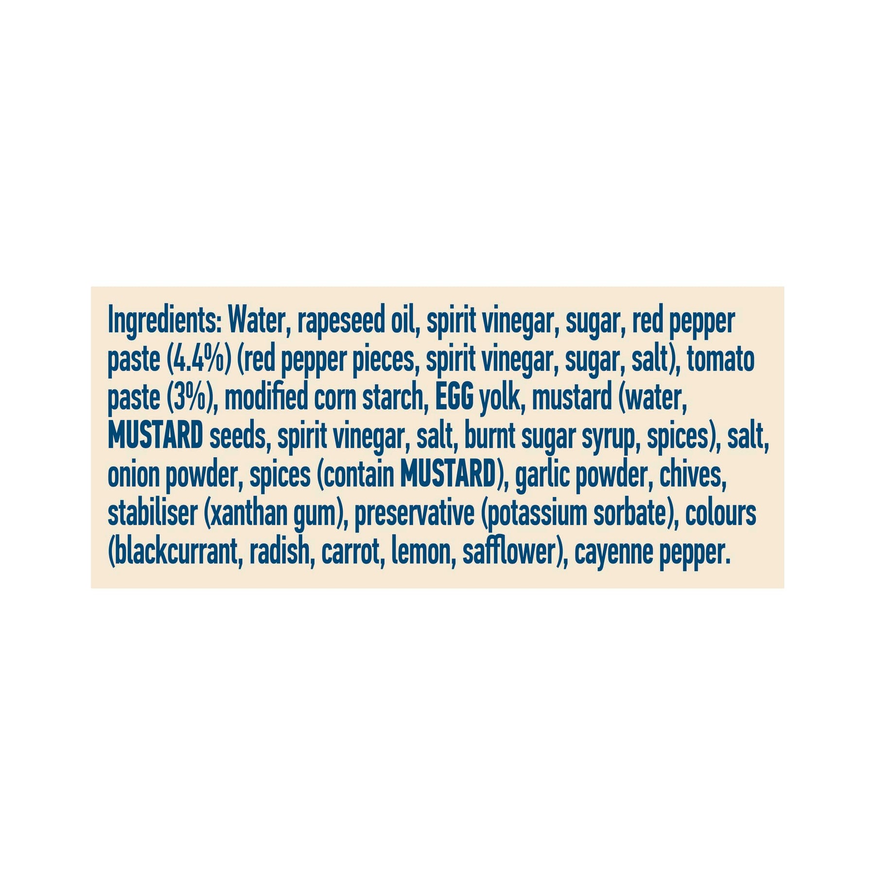 - Ingredients: Water, rapeseed oil, spirit vinegar, sugar, red pepper paste (4.4%), tomato paste (3%), egg yolk, mustard, salt, onion powder, spices (contain MUSTARD), garlic powder, chives, xanthan gum, potassium sorbate, natural colours (blackcurrant, radish, carrot, lemon, safflower), cayenne pepper