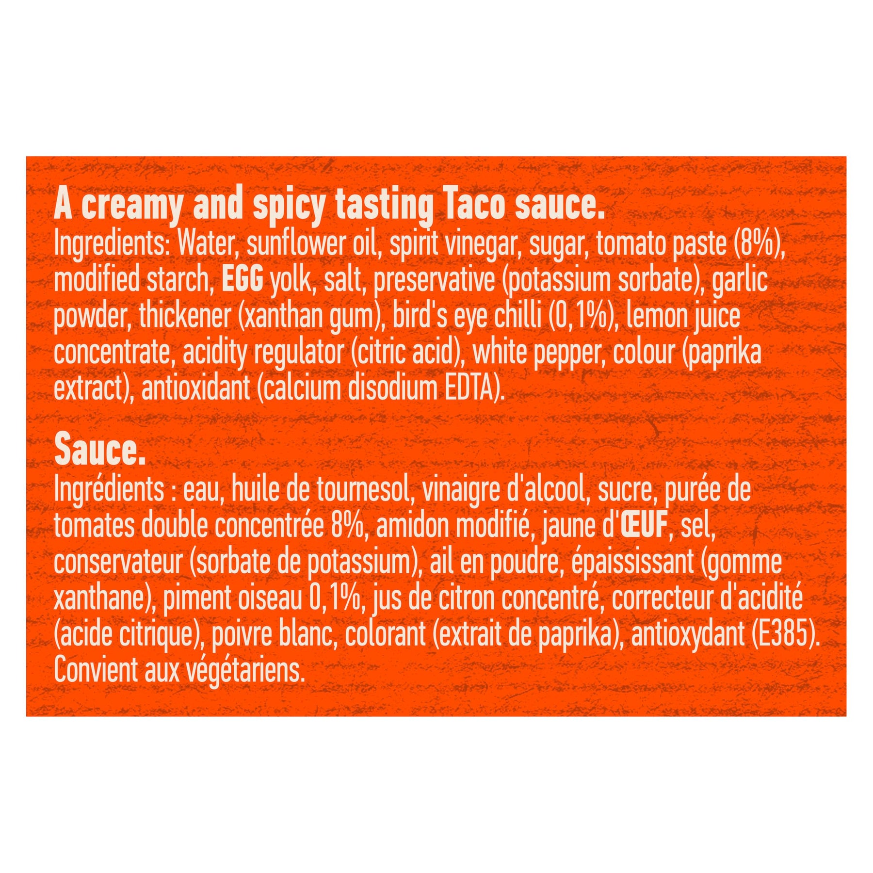 Hellmann's Taco Sauce brings a creamy texture with a spicy kick and authentic taco heat to elevate your favourite dishes. Made with quality ingredients including tomato paste (8%), egg yolk, and bird's eye chilli (0.1%), this sauce delivers bold flavour in every drop. Perfect for tacos, burgers, fries, and more, it adds a dash of great-tasting Hellmann's flavour to a wide variety of meals.