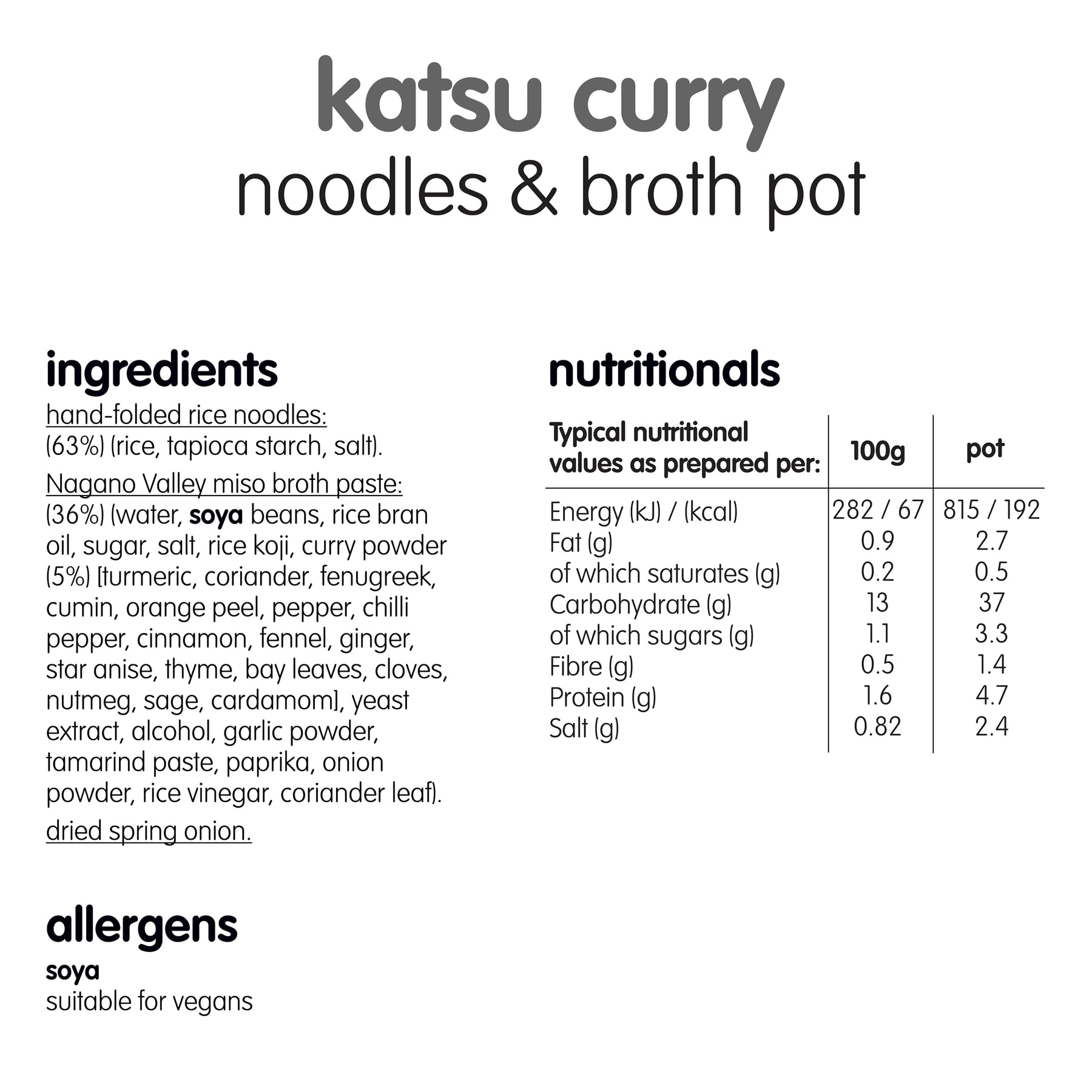 Ingredients: Hand-Folded Rice Noodles (63%) (Rice, Tapioca Starch, Salt), Nagano Valley Miso Broth Paste (36%) (Water, Soya Beans, Rice Bran Oil, Sugar, Salt, Rice Koji, Curry Powder [5%] [Turmeric, Coriander, Fenugreek, Cumin, Orange Peel, Pepper, Chilli Pepper, Cinnamon, Fennel, Ginger, Star Anise, Thyme, Bay Leaves, Cloves, Nutmeg, Sage, Cardamom], Yeast Extract, Alcohol, Garlic Powder, Tamarind Paste, Paprika, Onion Powder, Rice Vinegar, Coriander Leaf), Dried Spring Onion.