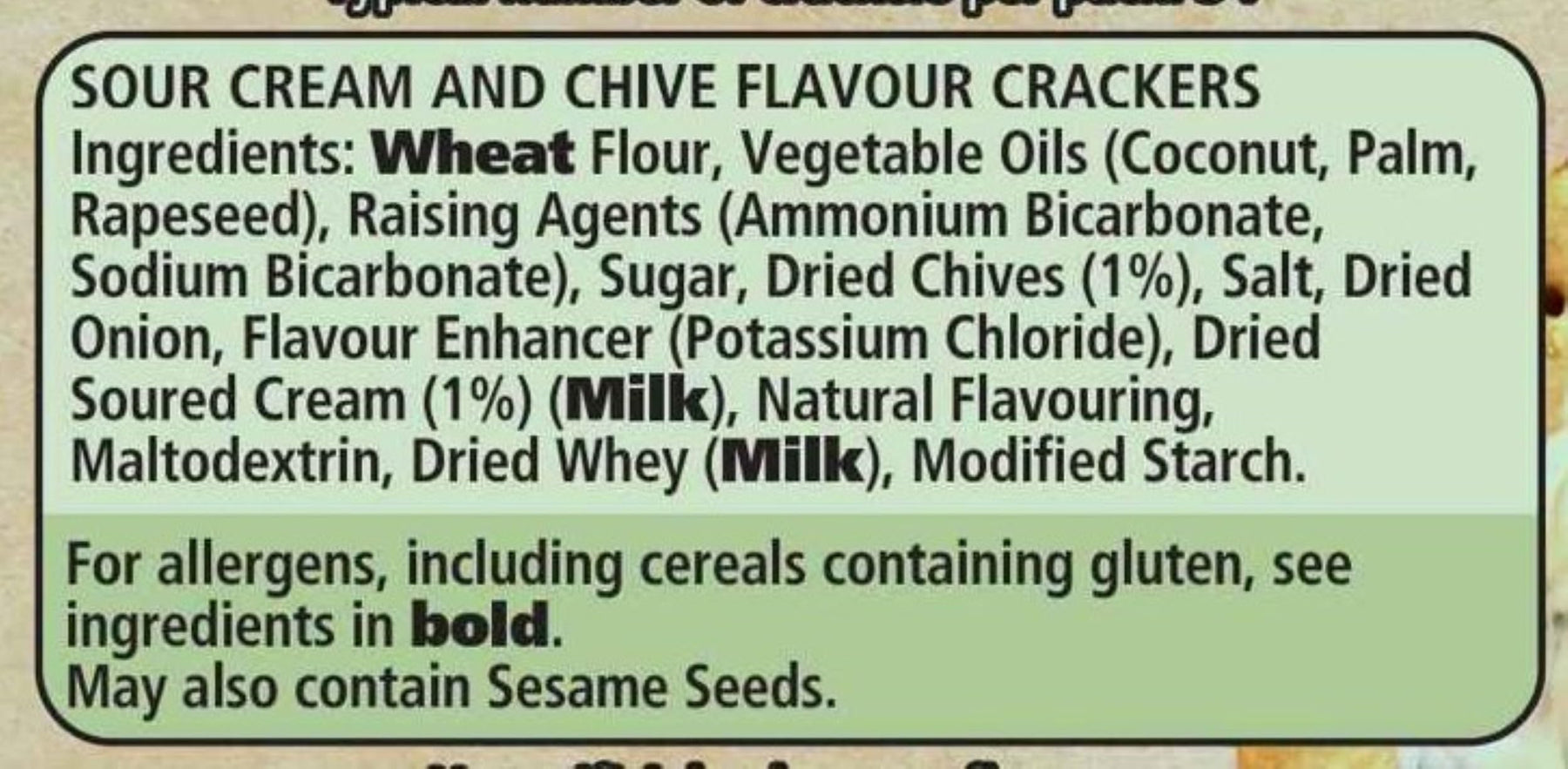 • Ingredients: Flour (WHEAT Flour, Calcium, Iron, Niacin, Thiamin), Vegetable Oil (palm), BARLEY and BARLEY Malt Extract, Glucose Syrup, Natural Flavouring (contains MILK), Salt, Raising Agents (Ammonium Bicarbonate, Sodium Bicarbonate), Dried Tomato Flakes (0.5%), Basil, Malted BARLEY Flour, Emulsifier (E472e), WHEAT Starch