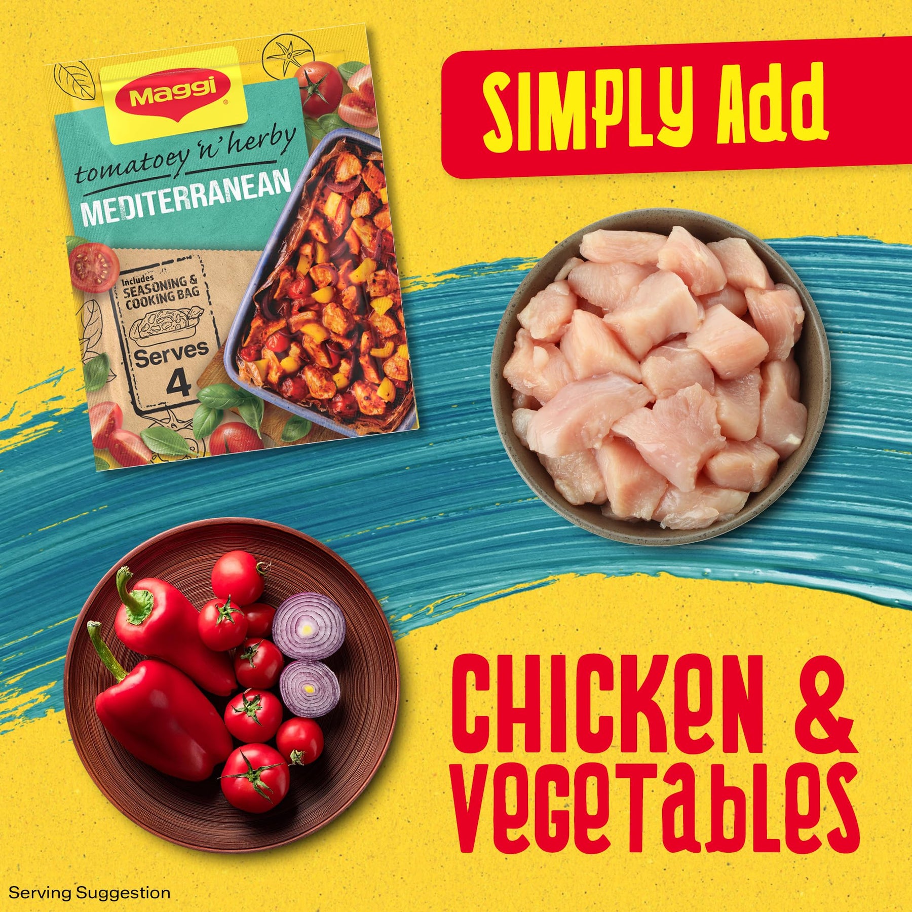 Prepare a delicious and aromatic Mediterranean Chicken Breast meal with ease using MAGGI So Juicy Chicken Mediterranean Recipe Mix. This convenient sachet includes a cooking bag for mess-free oven preparation, infusing your chicken with a rich blend of sweet basil, oregano, thyme, rosemary, and other herbs and spices. The tomatoey 'n' herby flavor profile delivers a savory, garden-fresh taste that fills your kitchen with an irresistible aroma.