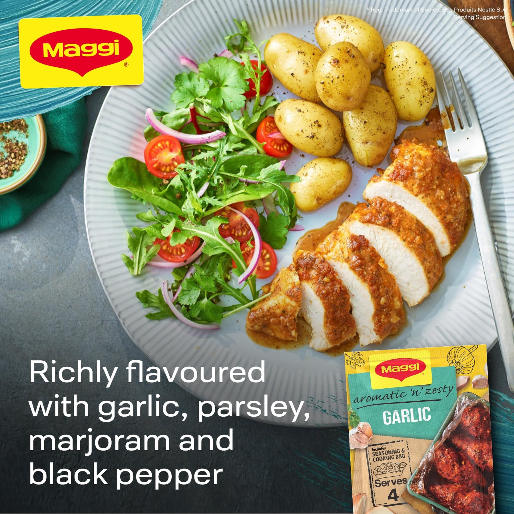 Maggi So Juicy Garlic Chicken Recipe Mix makes it effortless to prepare a flavorful, aromatic garlic chicken dish that's sure to impress. Perfect for busy weeknights or weekend family meals, this recipe mix combines a zesty garlic and herb seasoning blend with an easy-to-use cooking bag that locks in moisture and flavour, creating a rich, natural sauce as it roasts.