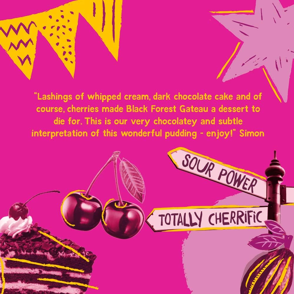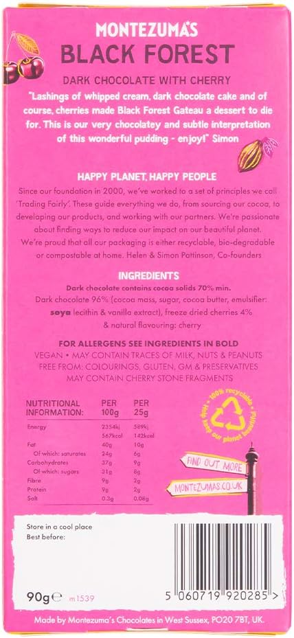 Indulge in Montezuma's rich and chocolatey interpretation of the beloved Black Forest Gateau dessert. This 90g dark chocolate bar blends 70% cocoa dark chocolate with freeze-dried cherries and natural cherry flavouring for a decadent, vegan-friendly treat that captures the essence of whipped cream, dark chocolate cake, and cherries in every bite.