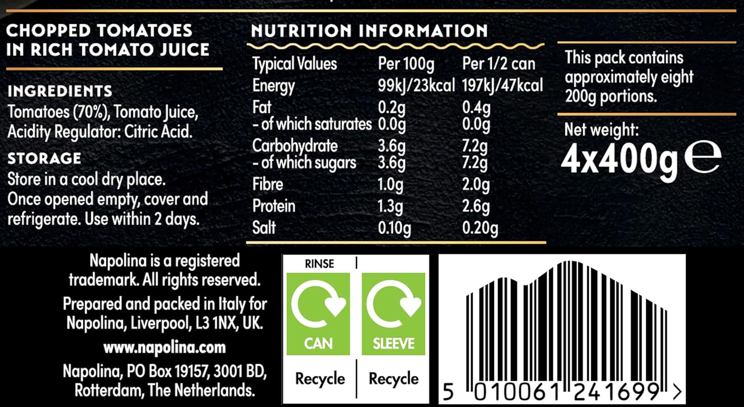 - Prepared and packed for: Napolina Ltd., Royal Liver Building, Pier Head, Liverpool, L3 1NX, UK
