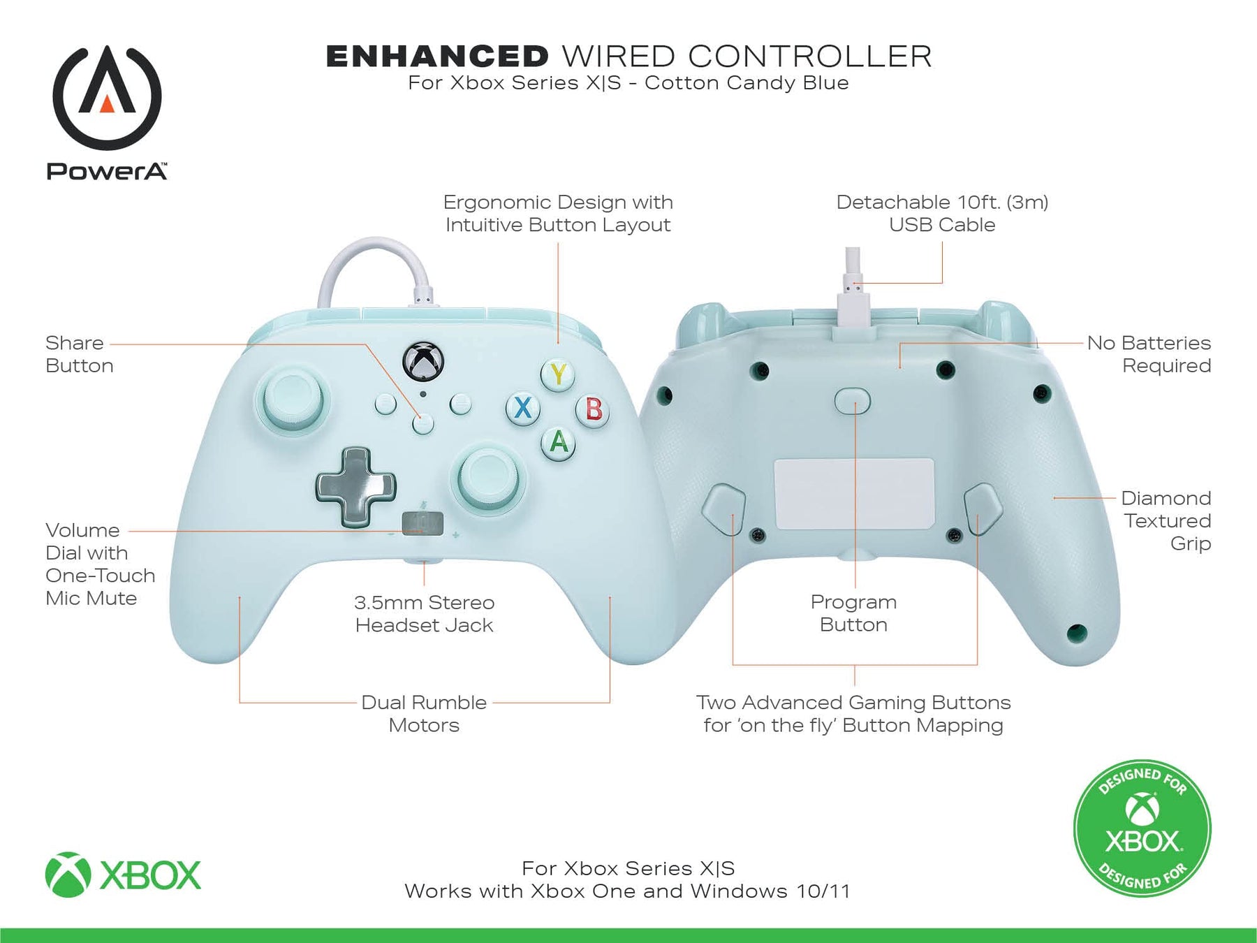 Experience enhanced gameplay with the PowerA Enhanced Wired Controller in a vibrant Cotton Candy Blue finish, officially licensed for Xbox Series X|S. Designed for comfort and precision, this controller features superior ergonomics and an intuitive button layout for seamless gaming sessions.