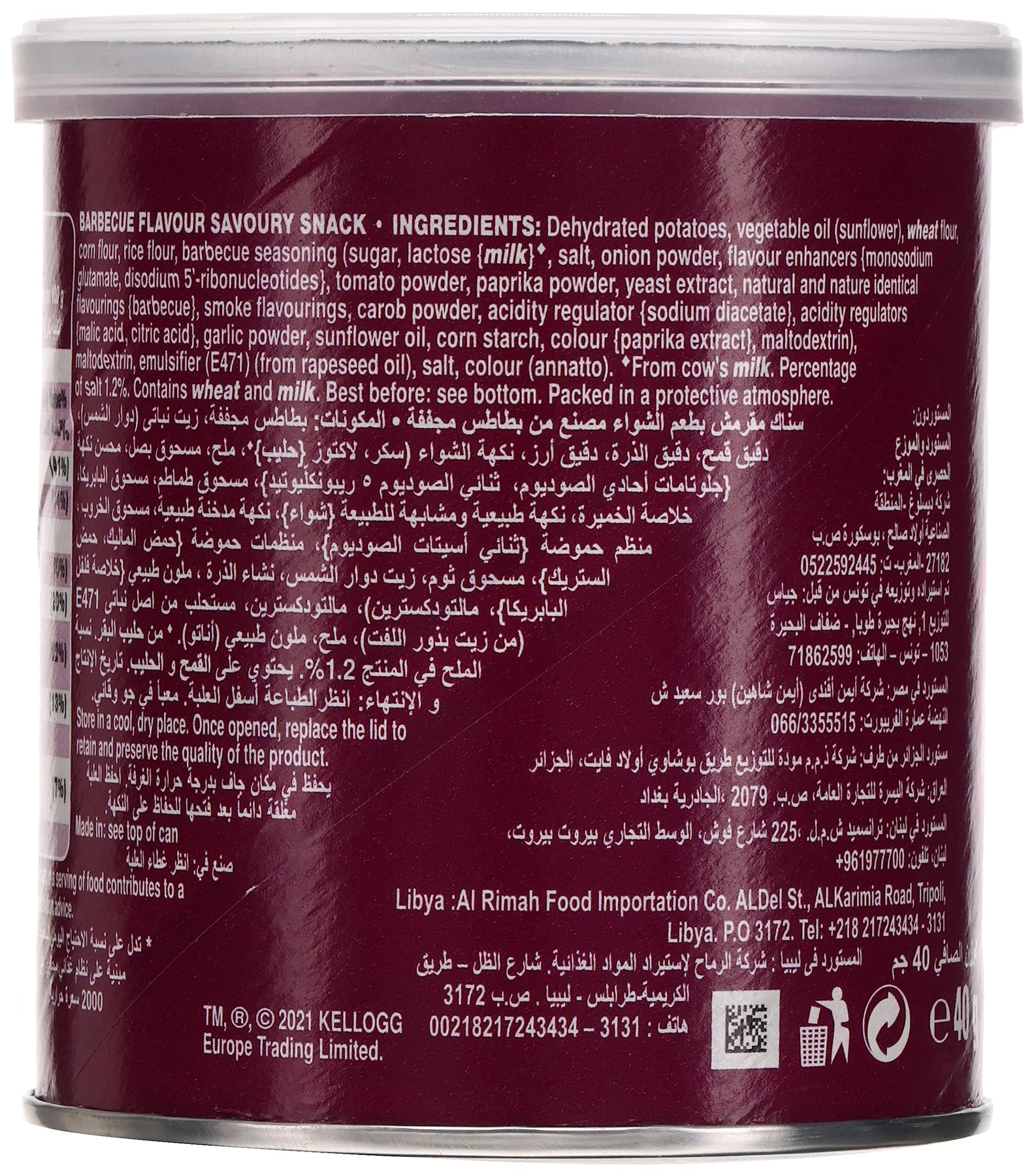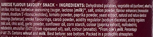 Ingredients: Dehydrated potatoes, sunflower oil, WHEAT flour, corn flour, rice flour, barbecue seasoning (sugar, lactose (MILK), salt, onion powder, flavour enhancers (monosodium glutamate, disodium 5'-ribonucleotides), tomato powder, paprika powder, yeast extract, flavourings, smoke flavourings, carob powder, acidity regulator (sodium diacetate), acids (malic acid, citric acid), garlic powder, sunflower oil, corn starch, colour (paprika extract), maltodextrin), maltodextrin, emulsifier (E471), salt, colour (annatto norbixin).