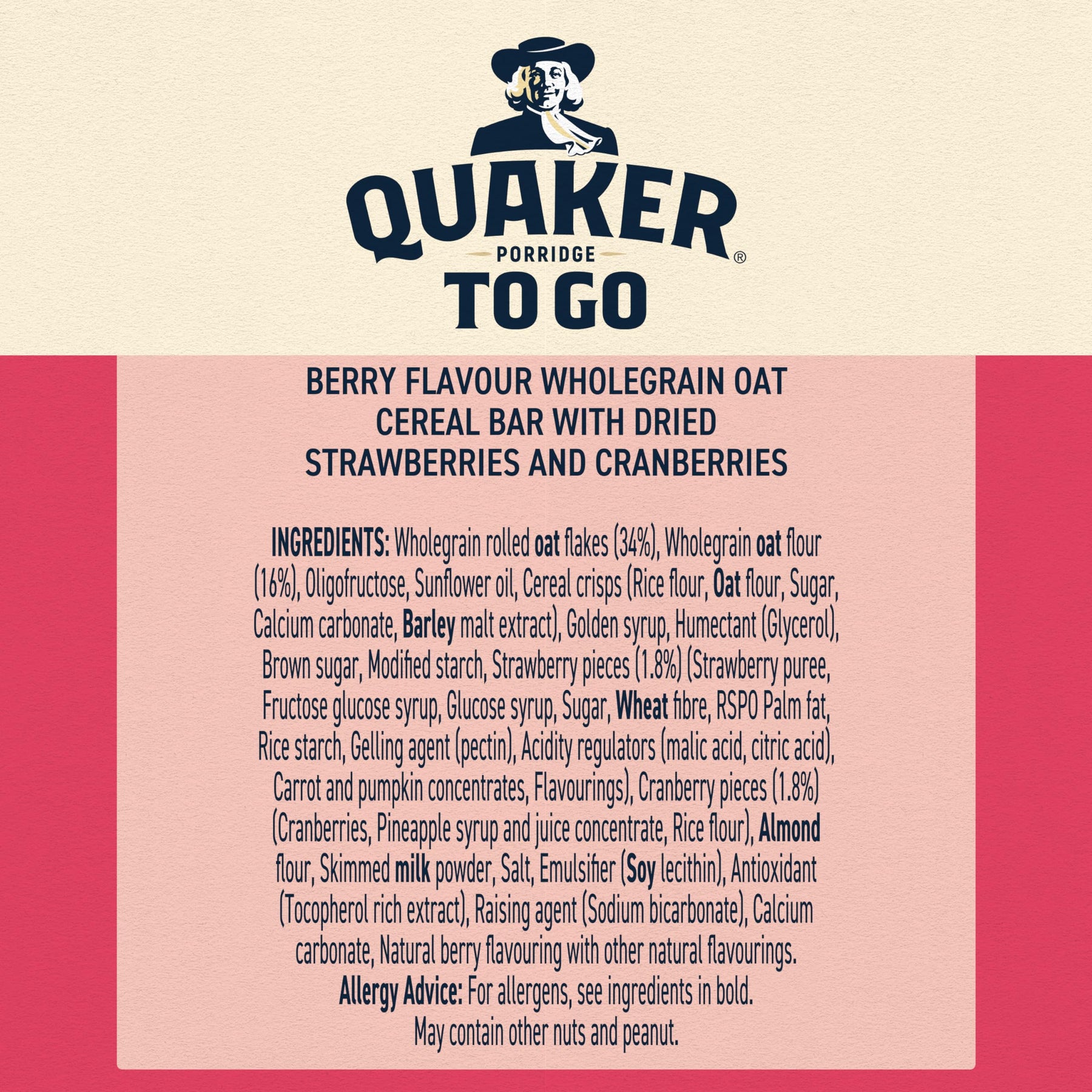 - Ingredients include wholegrain oats, sunflower oil, skimmed milk powder, and natural berry flavouring