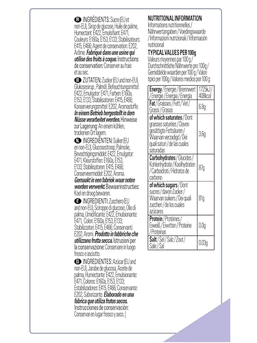 • Ingredients: Sugar (EU and non-EU), Glucose syrup, Palm oil, Humectant: E422, Emulsifier: E471, Colours: E160a, E153, E133; Stabilisers: E415, E466; Preservative: E202, Flavouring