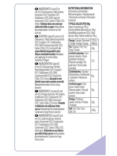 - Ingredients: sugar, glucose syrups, vegetable oil (palm), water, humectant (E422), emulsifier (E471), stabilizers (E415, E466), preservative (E202), colourings (E160a, E133), natural flavouring