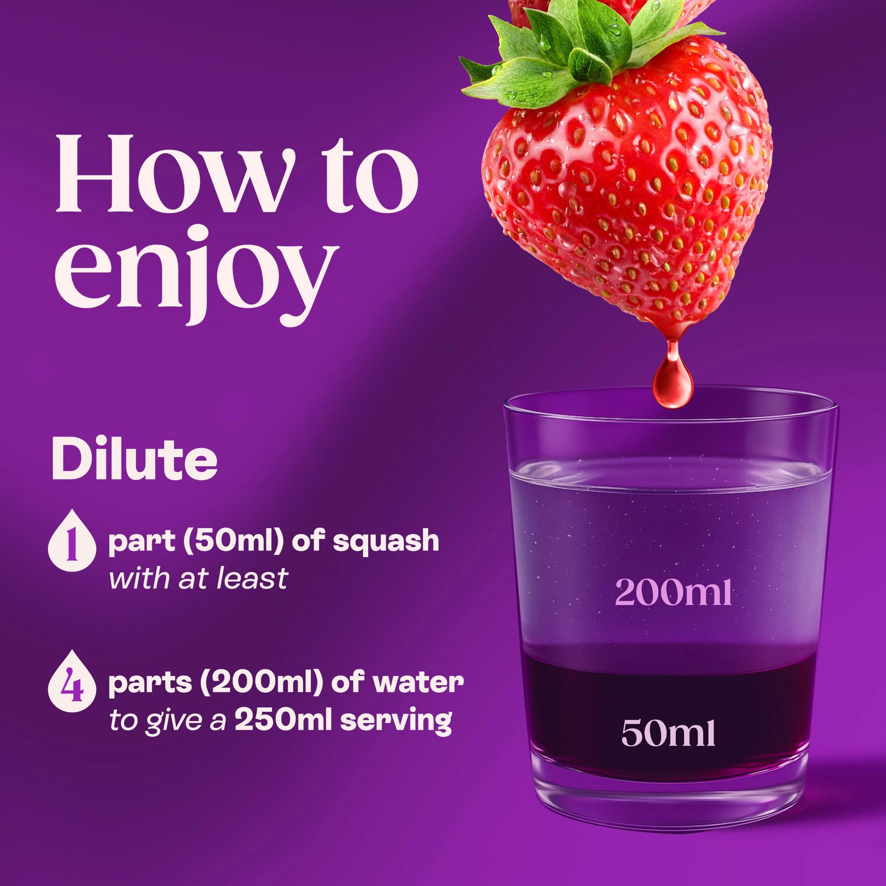 Lovely juicy strawberries make up this delightfully fruity squash, rich in vitamin C and crafted with real fruit juice. With no added sugar, no artificial colours or flavours, and low calories, it's a refreshing drink perfect for everyday family moments at home.