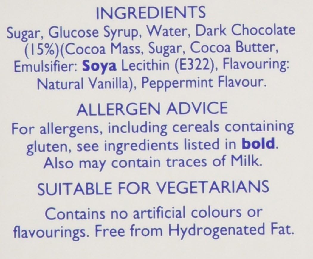 Sugar, Glucose Syrup, Water, Dark Chocolate 15% (Cocoa Mass, Sugar, Cocoa Butter, Emulsifier: SOYA Lecithin (E322), Flavouring: Natural Vanilla), Peppermint Flavour.