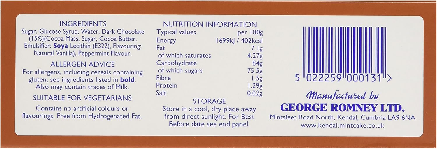 Package Contents:- 1 x Romney's Chocolate Covered Kendal Mint Cake (113g)