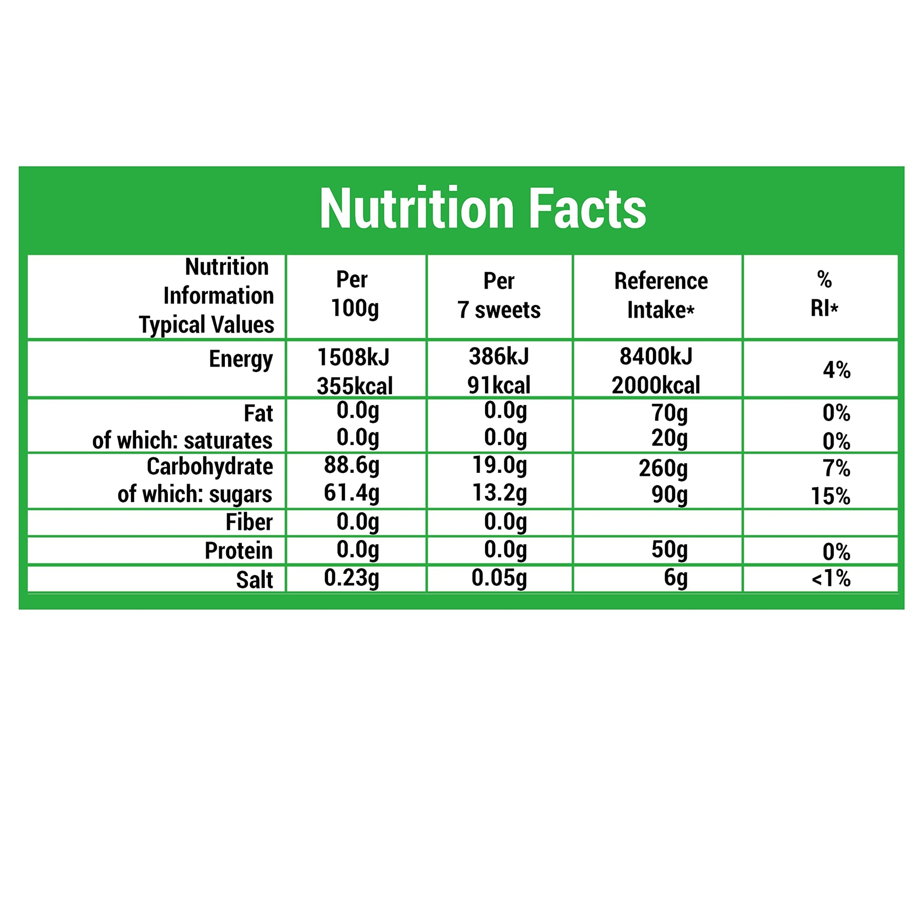 - Ingredients: Sugar, Glucose Syrup, Starch, Invert Sugar Syrup, Acids (Malic Acid, Citric Acid, Lactic Acid, Acetic Acid), Concentrated Fruit Juices (1.2%) (Apple, Blackcurrant, Lime, Orange, Strawberry, Lemon), Acidity Regulator (Trisodium Citrate), Flavourings, Colours (Anthocyanins, Copper Complexes of Chlorophyllins, Beta-Carotene, Curcumin)