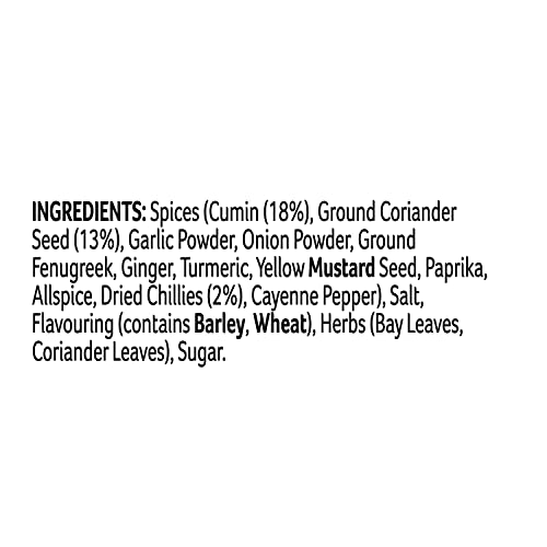 Ingredients: Spices (cumin 18%, ground coriander seed 13%, garlic powder, onion powder, ground fenugreek, ginger, turmeric, yellow MUSTARD seed, paprika, allspice, dried chillies 2%, cayenne pepper), salt, flavouring contains (BARLEY, WHEAT), herbs (bay leaves, coriander leaves), sugar.