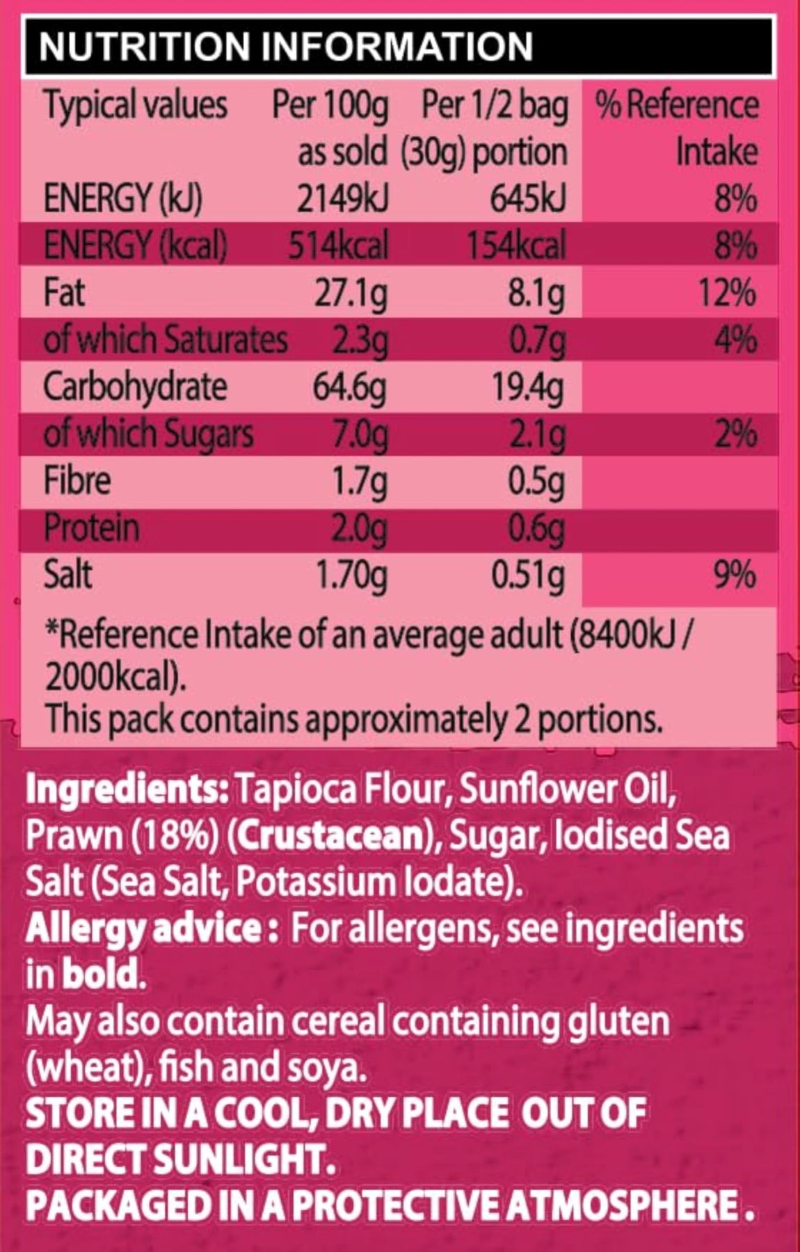Ingredients: Tapioca Flour, Sunflower Oil, Prawns (15%) (CRUSTACEANS), Sugar, EGG, Iodised Sea Salt.