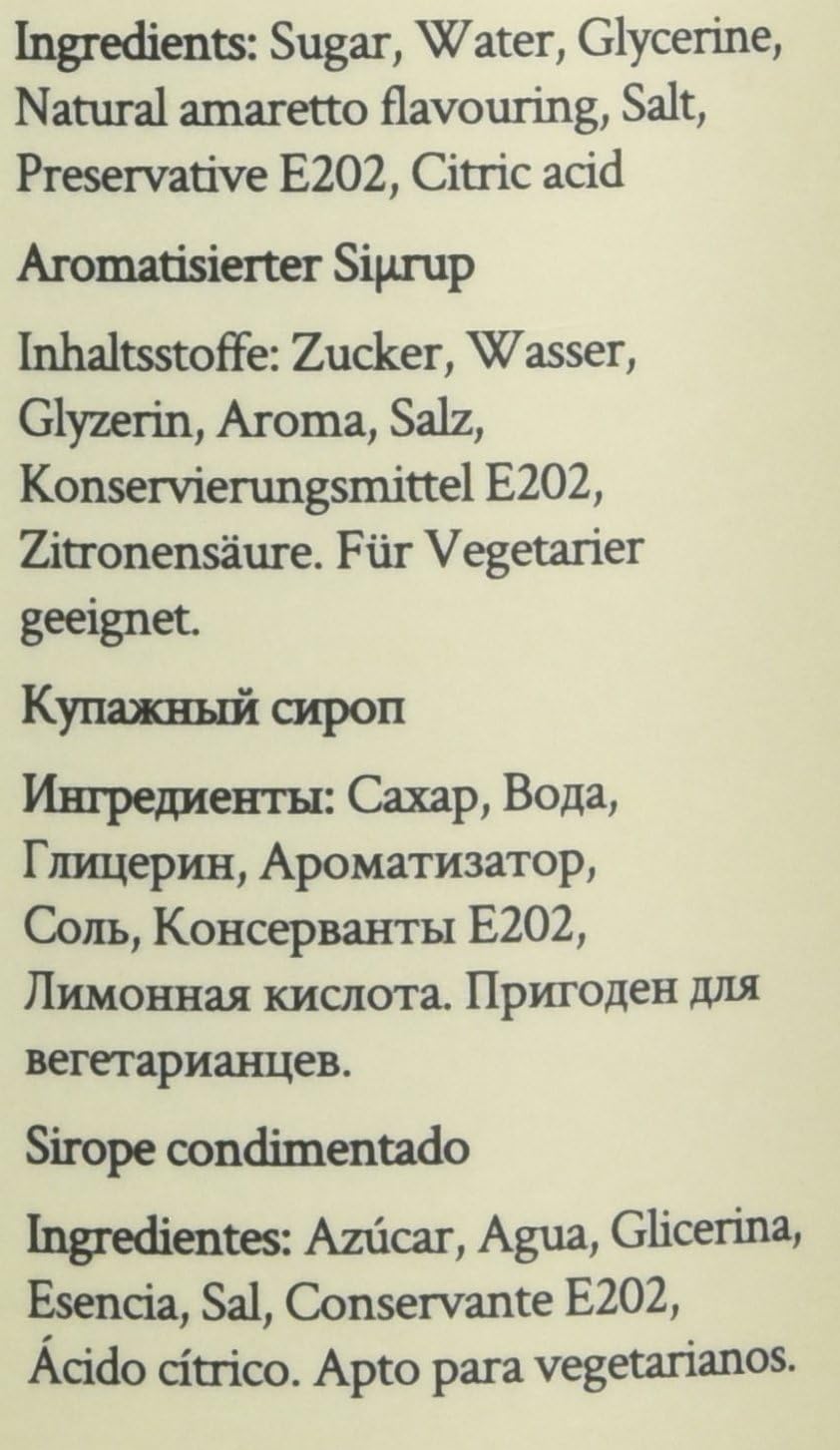 - Ingredients: Sugar, Water, Glycerine, Natural amaretto flavouring, Salt, Preservative E202, Citric acid