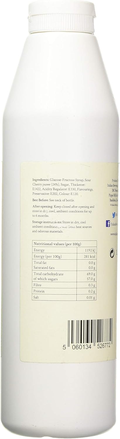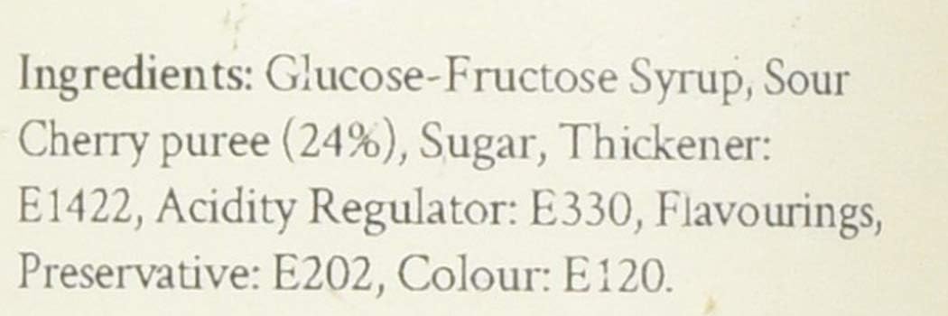• Ingredients: Glucose-Fructose Syrup, Sour Cherry puree (24%), Sugar, Thickener: E1422, Acidity Regulator: E330, Flavourings, Preservative: E202, Colour: E120
