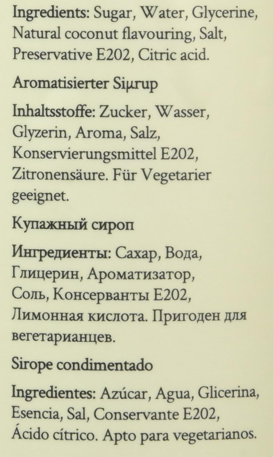 Sugar, water, glycerine, natural coconut flavouring, salt, preservative E202, and citric acid make up this versatile coconut syrup from Simply. Ideal for adding rich coconut flavour to coffee, cocktails, desserts, and more. Shake well before use and store in a cool, dry place. Once opened, keep refrigerated to maintain freshness.