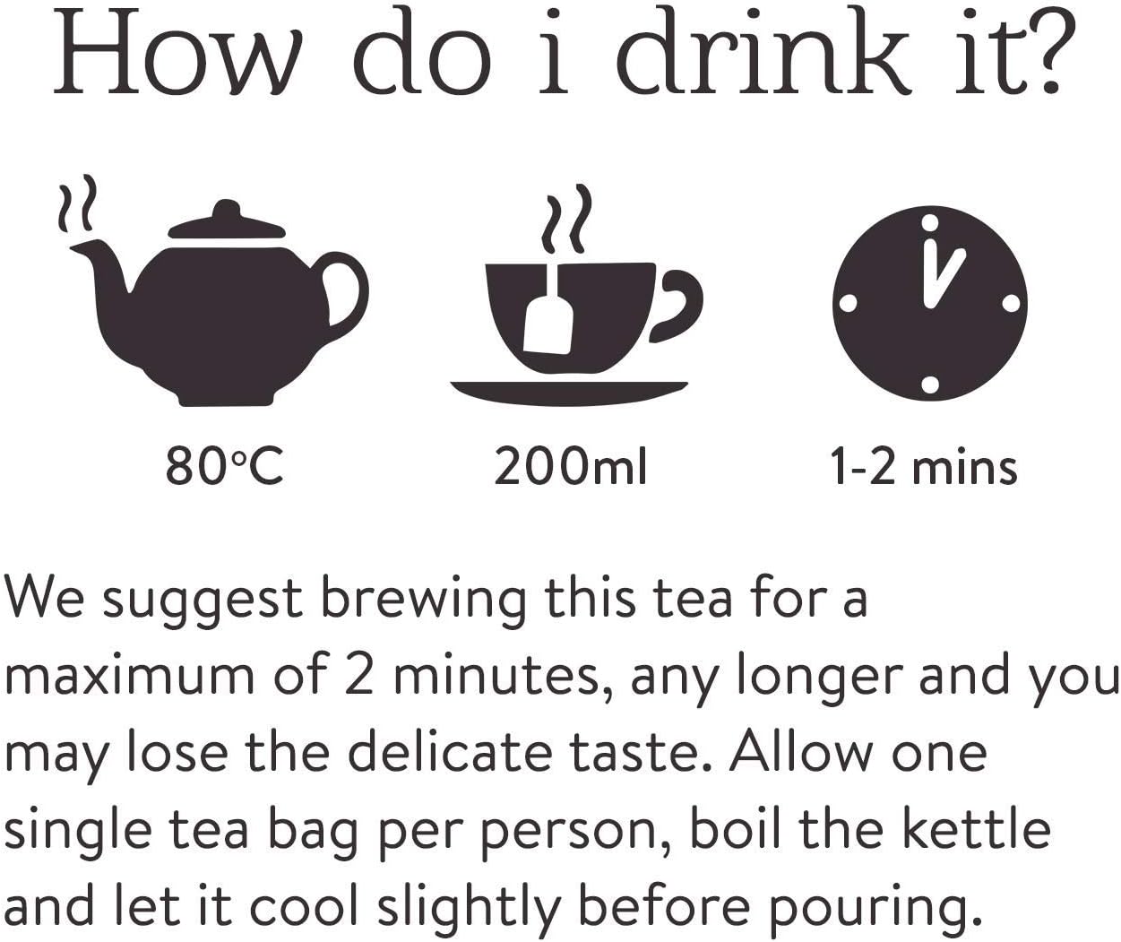 Brewing Directions: Use freshly boiled water, allow to cool for 3–4 minutes. Use one tea bag per cup or person. Brew for 1–3 minutes to taste.