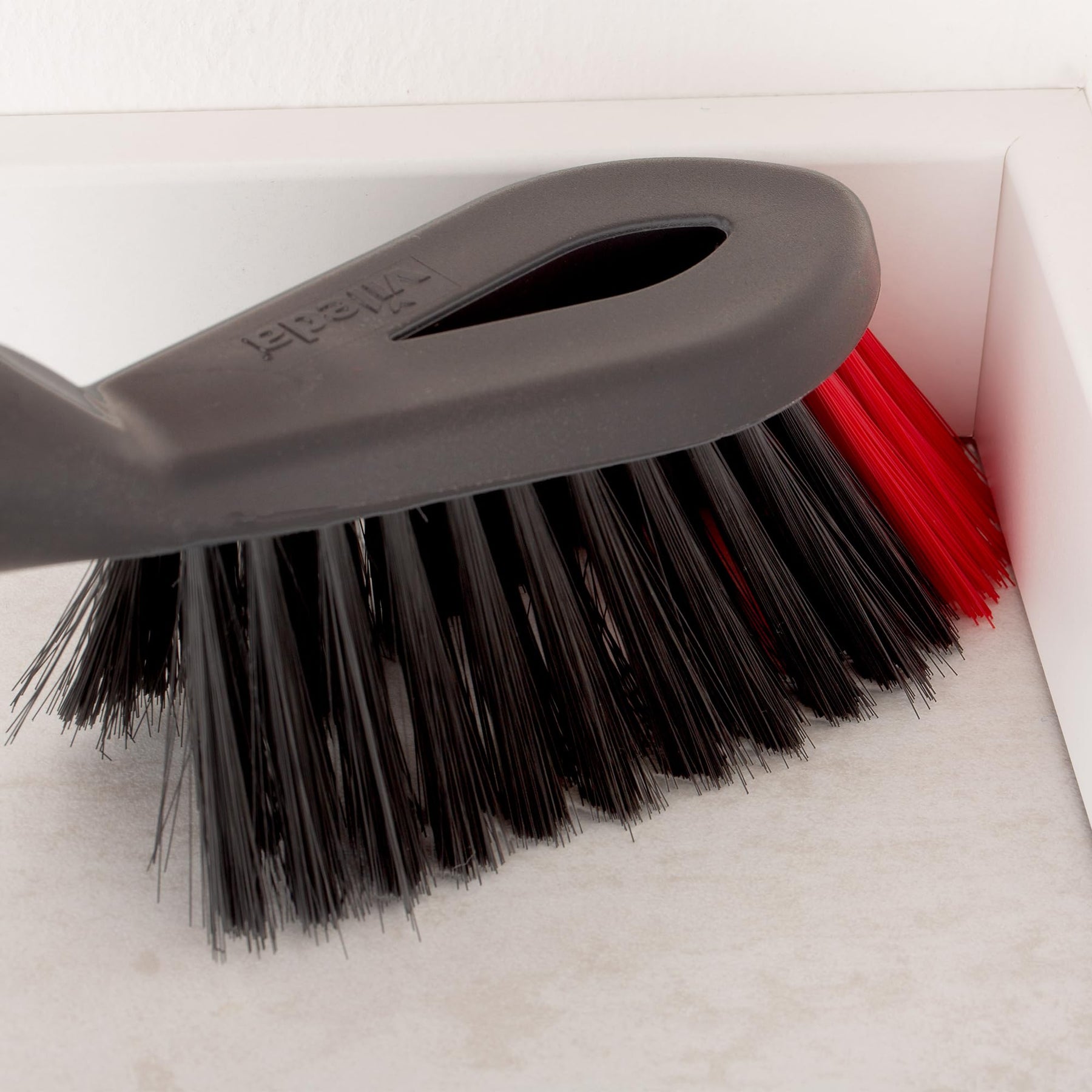 • 2-in-1 fibre sweeper with soft black fibres for dust and stiff red bristles for edges