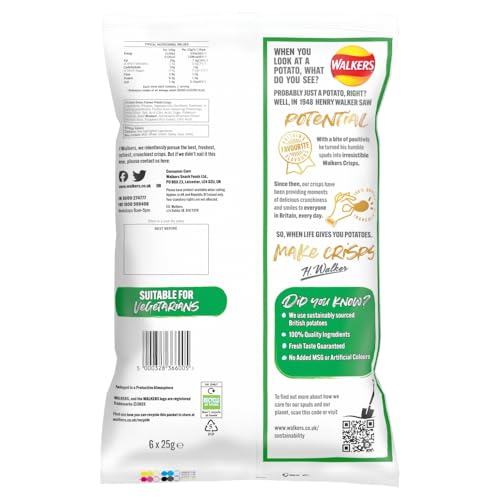 Walkers Pickled Onion Crisps are made with 100% Great British potatoes, carefully cooked with sunflower and rapeseed oils for a naturally lower saturate snack. Each multipack contains 6 individual 25g bags, perfect for lunchboxes, on-the-go snacking, or sharing.