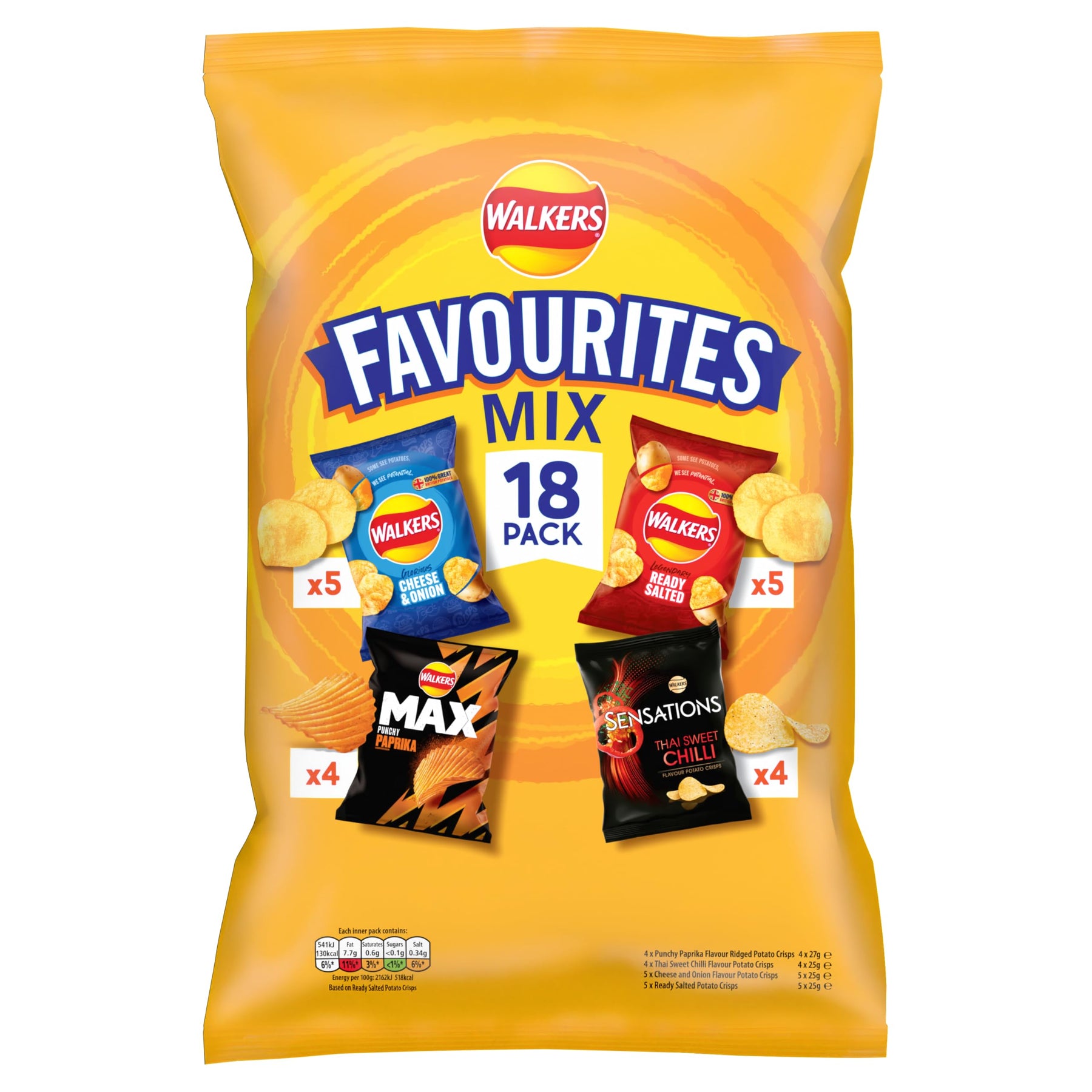 Walkers Favourites Mix brings together the nation's most iconic crisp flavours in one convenient 18-pack. Enjoy the irresistible tastes of Walkers Cheese & Onion, Walkers Ready Salted, Max Punchy Paprika, and Sensations Thai Sweet Chilli. Perfect for parties or sharing with family and friends, this multi-pack delivers variety and flavour in every bite. Since 1948, Walkers has been crafting crisps using 100% Great British potatoes, maintaining a tradition of quality and taste that has made it a staple in UK households for over 70 years.