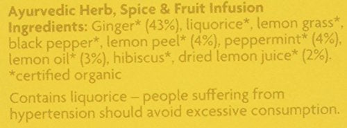 • Organic blend of ginger (43%), lemon peel (4%), peppermint (4%), and other natural ingredients