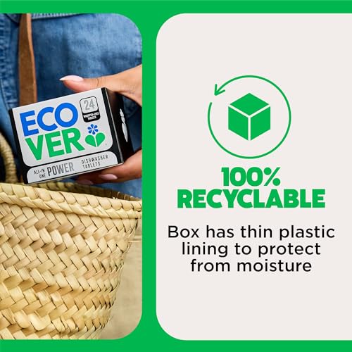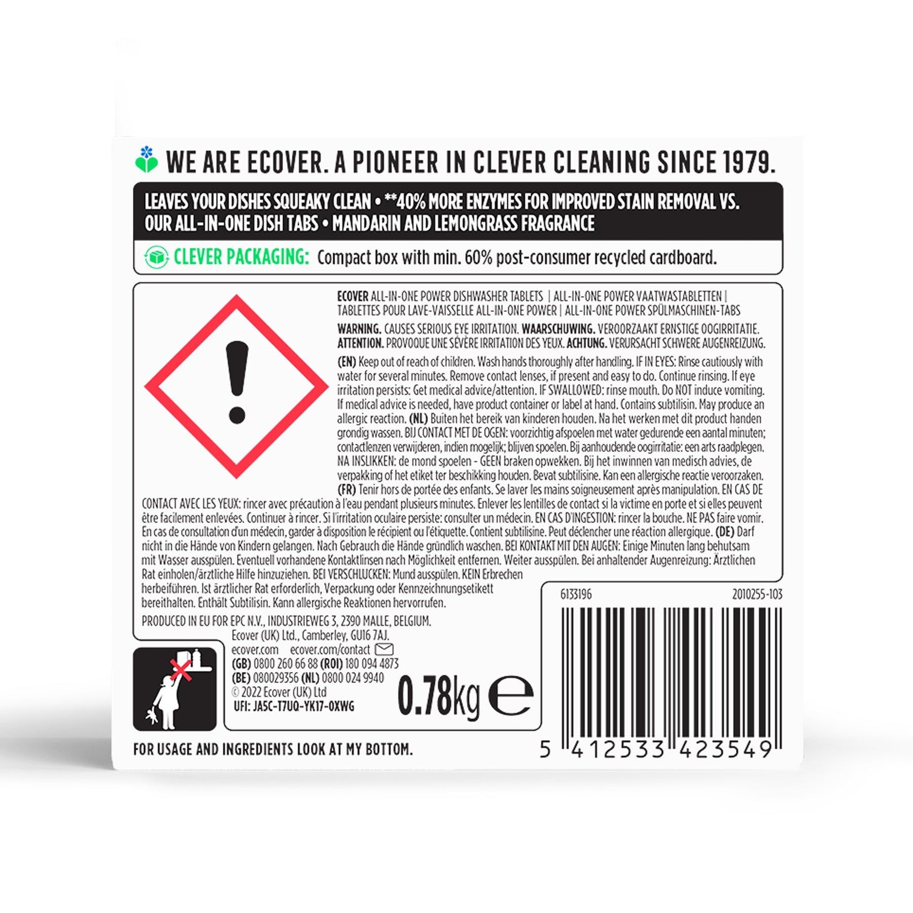 Ecover All-In-One Power Dishwasher Tablets deliver powerful, eco-conscious cleaning for spotless dishes and a fresher kitchen environment. Formulated with 40% more enzymes, these tablets tackle stubborn grease and tough food residues while leaving behind a refreshing mandarin and lemongrass scent.
