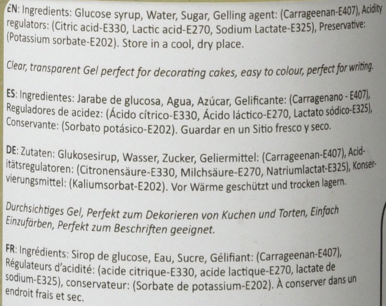 PME Piping Gel is a versatile and essential baking ingredient perfect for cake decorating. Ideal for writing, highlighting, or glazing cakes before icing, this clear, transparent gel delivers professional results every time. Use it as-is or easily tint it with your favorite food coloring to create stunning visual effects like water, stained glass windows, or royal icing stringwork.